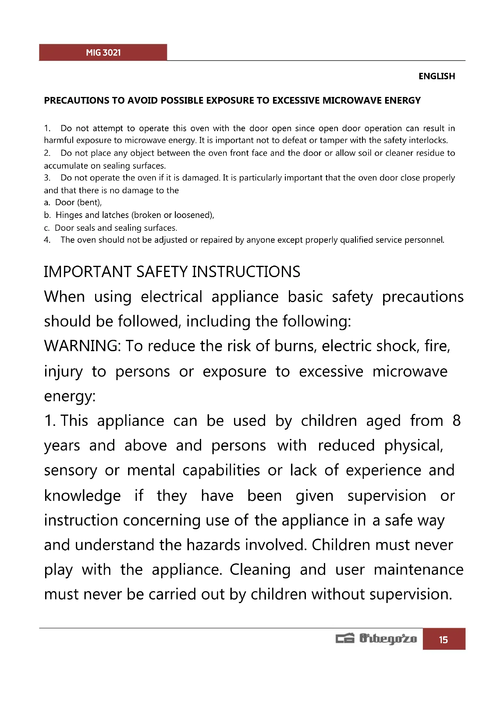 oven must not be used until properly repaired by qualified service personnel.MIG 3021