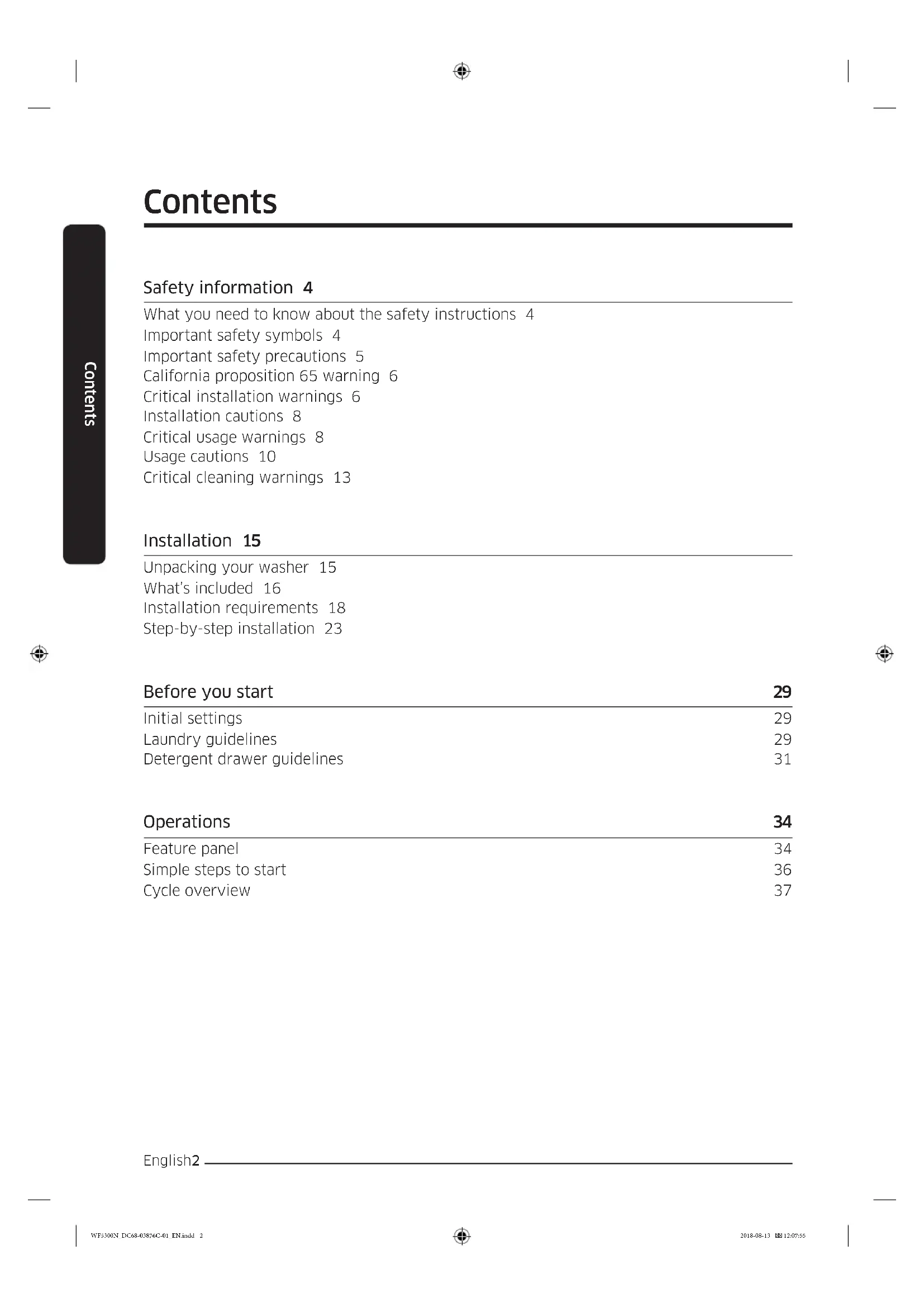 Washer User manual WF45N5300A* WF5300N_DC68-03876C-01_EN.indd 1 2018-08-13 12:07:55Contents English2 Contents Safety information 4 What you need to know about the safety instructions 4 Important safety symbols 4 Important safety precautions 5 California proposition 65 warning 6 Critical installation warnings 6 Installation cautions 8 Critical usage warnings 8 Usage cautions 10 Critical cleaning warnings 13 Installation 15 Unpacking your washer 15 What’s included 16 Installation requirements 18 Step-by-step installation 23 Before you start 29 Initial settings 29 Laundry guidelines 29 Detergent drawer guidelines 31 Operations 34 Feature panel 34 Simple steps to start 36 Cycle overview 37 WF5300N_DC68-03876C-01_EN.indd 2 2018-08-13 12:07:55Contents English 3 Maintenance 42 Self Clean+ 42 Smart Care 43 Emergency drain 44 Cleaning 45 Recovery from freezing 48 Care against an extended time of disuse 48 Cleaning the exterior 49 Cleaning the interior 49 Troubleshooting 50 Checkpoints 50 Information codes 54 Specications 56 Fabric care chart 56 Protecting the environment 57 Declaration of conformity 57 Specication sheet 58 Cycle chart 59 WF5300N_DC68-03876C-01_EN.indd 3 2018-08-13 12:07:55Safety information