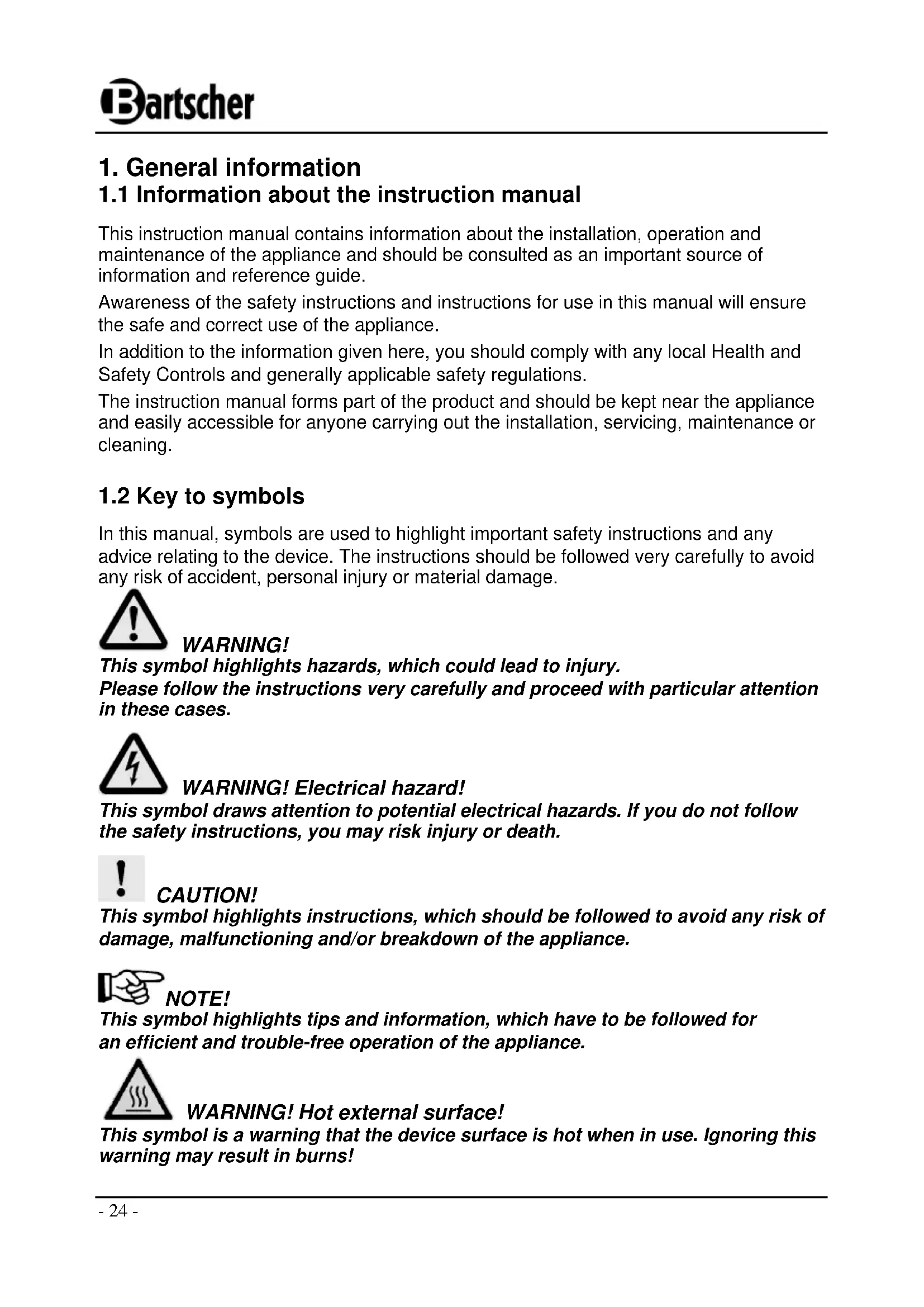In this manual, symbols are used to highlight important safety instructions and any advice relating to the device. The instructions should be followed very carefully to avoid any risk of accident, personal injury or material damage. WARNING! This symbol highlights hazards, which could lead to injury. Please follow the instructions very carefully and proceed with particular attention in these cases. WARNING! Electrical hazard! This symbol draws attention to potential electrical hazards. If you do not follow the safety instructions, you may risk injury or death. CAUTION! This symbol highlights instructions, which should be followed to avoid any risk of damage, malfunctioning and/or breakdown of the appliance. NOTE! This symbol highlights tips and information, which have to be followed for an efficient and trouble-free operation of the appliance. WARNING! Hot external surface! This symbol is a warning that the device surface is hot when in use. Ignoring this warning may result in burns!- 25 -