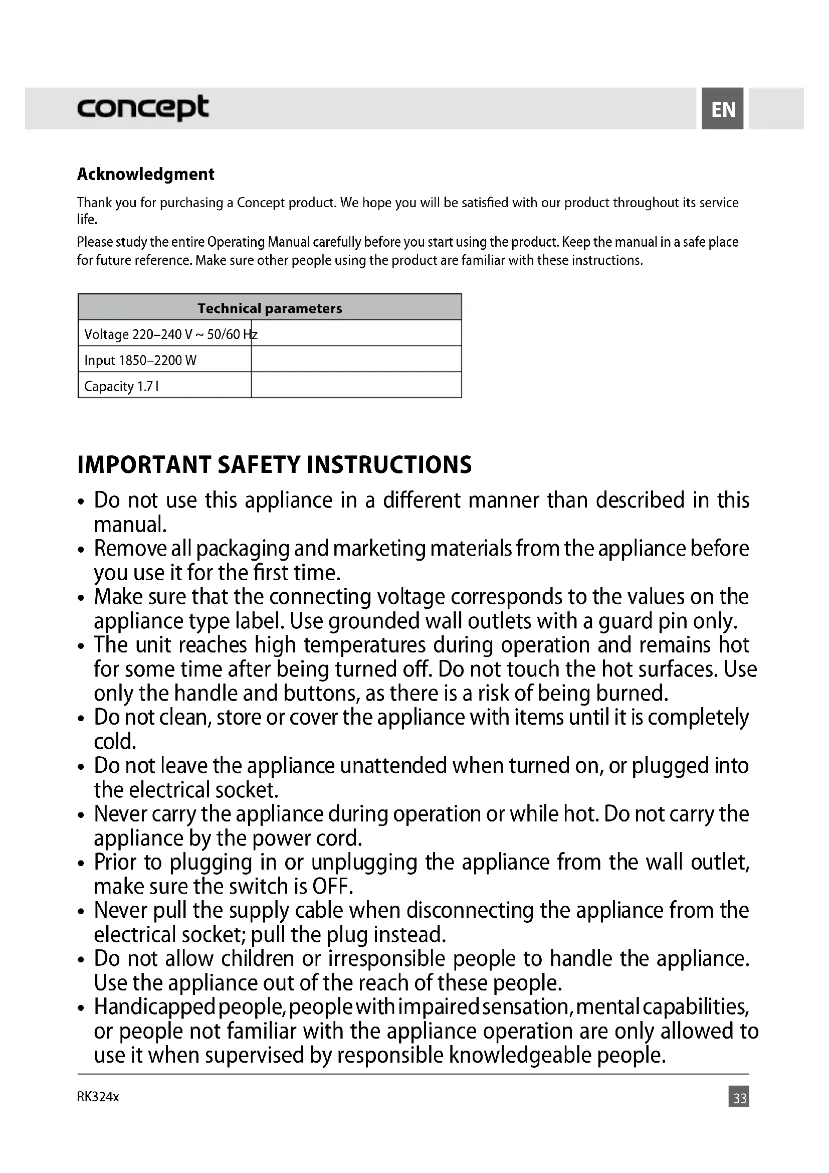 Acknowledgment Thank you for purchasing a Concept product. We hope you will be satisfied with our product throughout its service life. Please study the entire Operating Manual carefully before you start using the product. Keep the manual in a safe place for future reference. Make sure other people using the product are familiar with these instructions. Technical parameters Voltage 220–240 V ~ 50/60 Hz Input 1850–2200 W Capacity 1.7 l