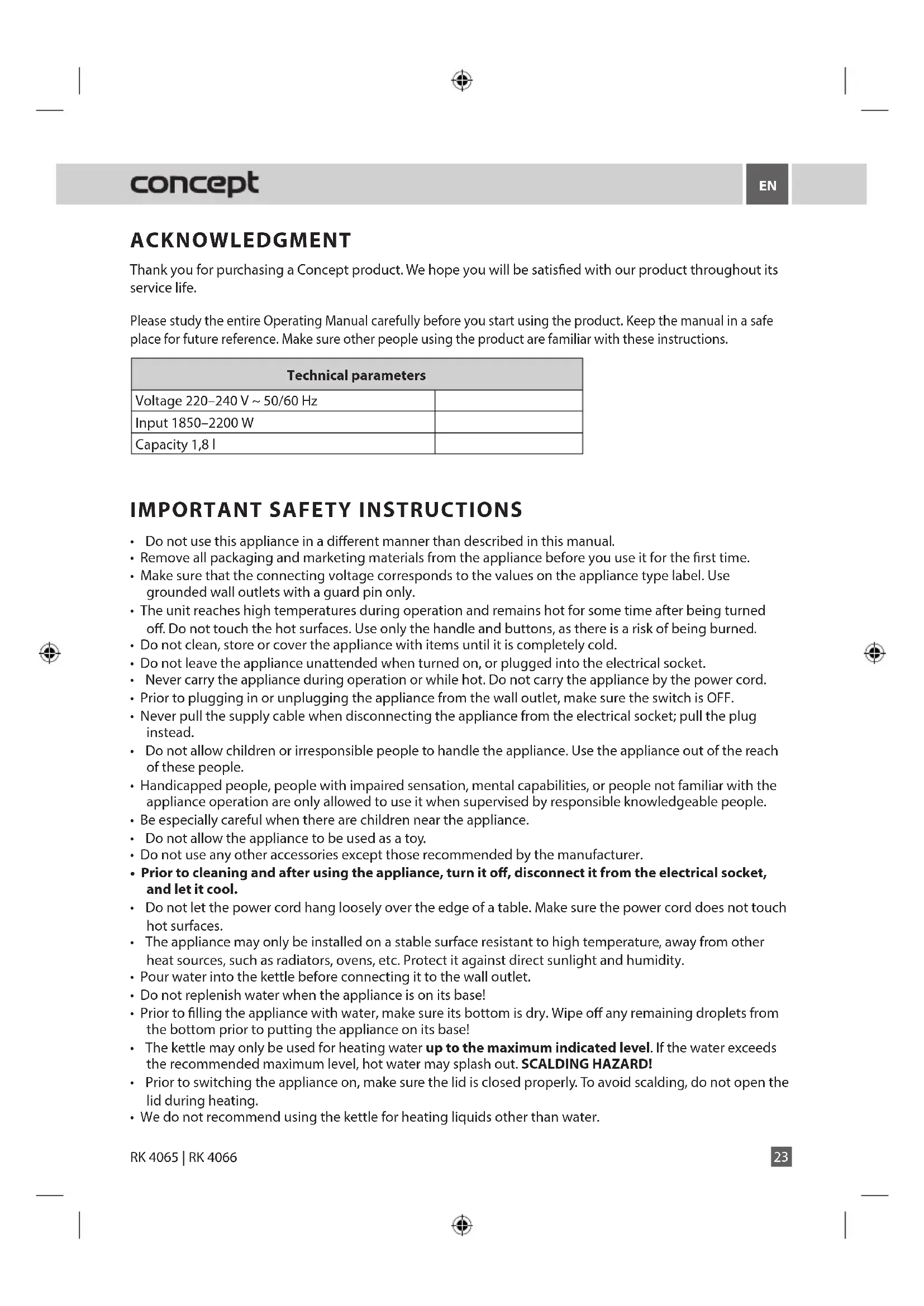 Thank you for purchasing a Concept product. We hope you will be satised with our product throughout its service life. Please study the entire Operating Manual carefully before you start using the product. Keep the manual in a safe place for future reference. Make sure other people using the product are familiar with these instructions. Technical parameters Voltage 220–240 V ~ 50/60 Hz Input 1850–2200 W Capacity 1,8 l