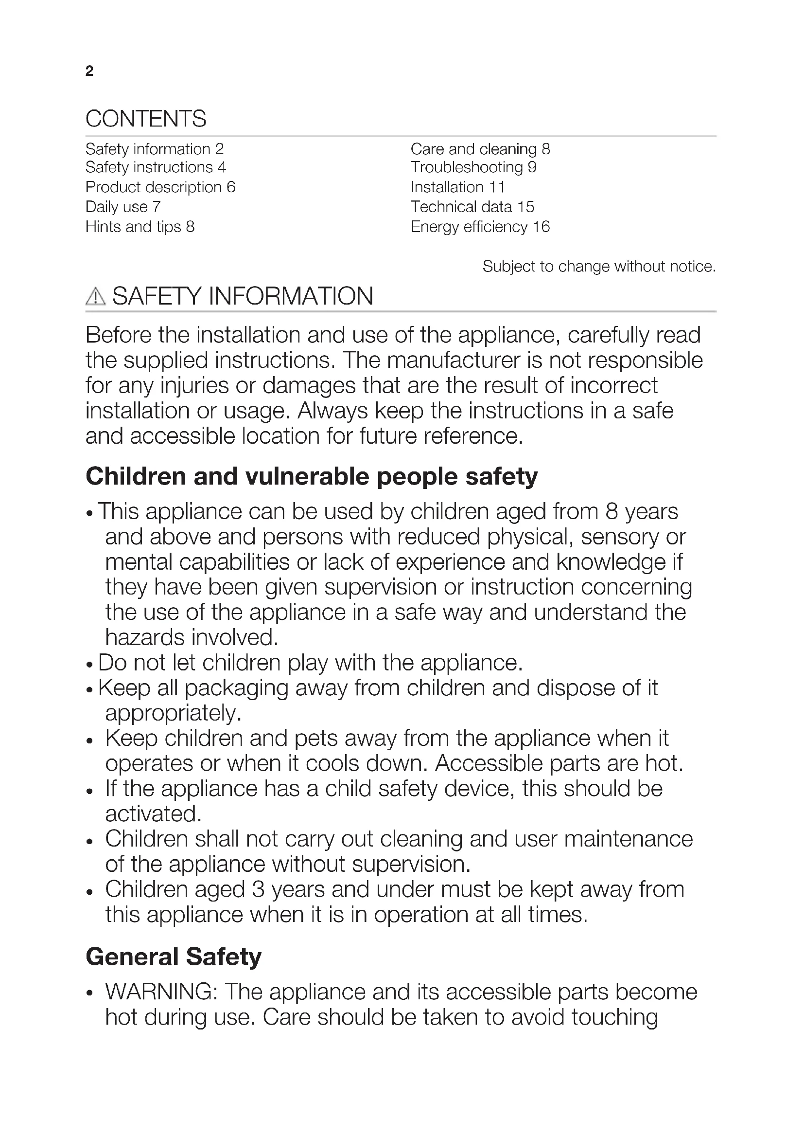 Kochfeld Benutzerinformation 35CONTENTS Safety information 2 Safety instructions 4 Product description 6 Daily use 7 Hints and tips 8 Care and cleaning 8 Troubleshooting 9 Installation 11 Technical data 15 Energy efficiency 16 Subject to change without notice. SAFETY INFORMATION Before the installation and use of the appliance, carefully read the supplied instructions. The manufacturer is not responsible for any injuries or damages that are the result of incorrect installation or usage. Always keep the instructions in a safe and accessible location for future reference. Children and vulnerable people safety
