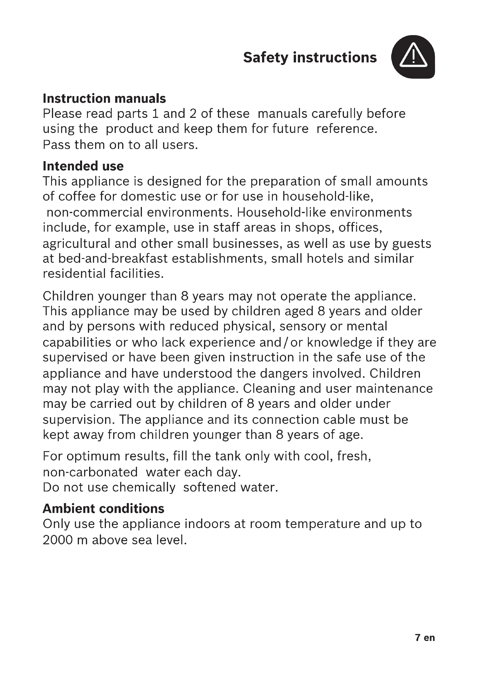 Instruction manuals Please read parts 1 and 2 of these manuals carefully before using the product and keep them for future reference. Passthemon to all users. Intended use This appliance is designed for the preparation of small amounts of coffee for domestic use or for use in household-like, non-commercial environments. Household-like environments include, for example, use in staff areas in shops, offices, agricultural and other small businesses, as well as use by guests at bed-and-breakfast establishments, small hotels and similar residential facilities. Children younger than 8 years may not operate the appliance. This appliance may be used by children aged 8 years and older and by persons with reduced physical, sensory or mental capabilities or who lack experience and / or knowledge if they are supervised or have been given instruction in the safe use of the appliance and have understood the dangers involved. Children may not play with the appliance. Cleaning and user maintenance may be carried out by children of 8 years and older under supervision. The appliance and its connection cable must be kept away from children younger than 8 years of age. For optimum results, fill the tank only with cool, fresh, non-carbonated water each day. Do not use chemically softened water. Ambient conditions Only use the appliance indoors at room temperature and up to 2000 m above sea level.8en Safety instructions