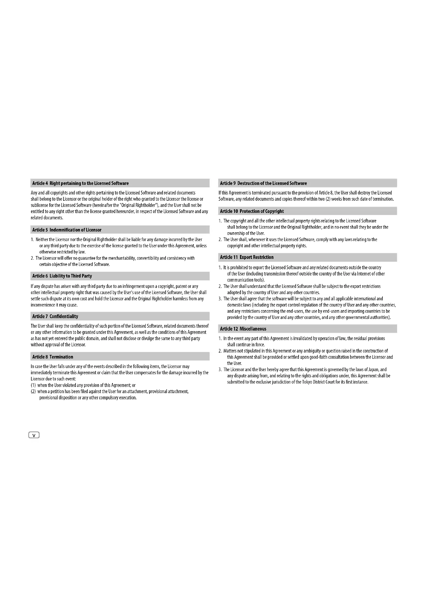 certain objective of the Licensed Software. Article 6 Liability to Third Party If any dispute has arisen with any third party due to an infringement upon a copyright, patent or any other intellectual property right that was caused by the User's use of the Licensed Software, the User shall settle such dispute at its own cost and hold the Licensor and the Original Rightholder harmless from any inconvenience it may cause. Article 7 Confidentiality The User shall keep the confidentiality of such portion of the Licensed Software, related documents thereof or any other information to be granted under this Agreement, as well as the conditions of this Agreement as has not yet entered the public domain, and shall not disclose or divulge the same to any third party without approval of the Licensor. Article 8 Termination In case the User falls under any of the events described in the following items, the Licensor may immediately terminate this Agreement or claim that the User compensates for the damage incurred by the Licensor due to such event: (1) when the User violated any provision of this Agreement; or (2) when a petition has been filed against the User for an attachment, provisional attachment, provisional disposition or any other compulsory execution. Article 9 Destruction of the Licensed Software If this Agreement is terminated pursuant to the provision of Article 8, the User shall destroy the Licensed Software, any related documents and copies thereof within two (2) weeks from such date of termination. Article 10 Protection of Copyright