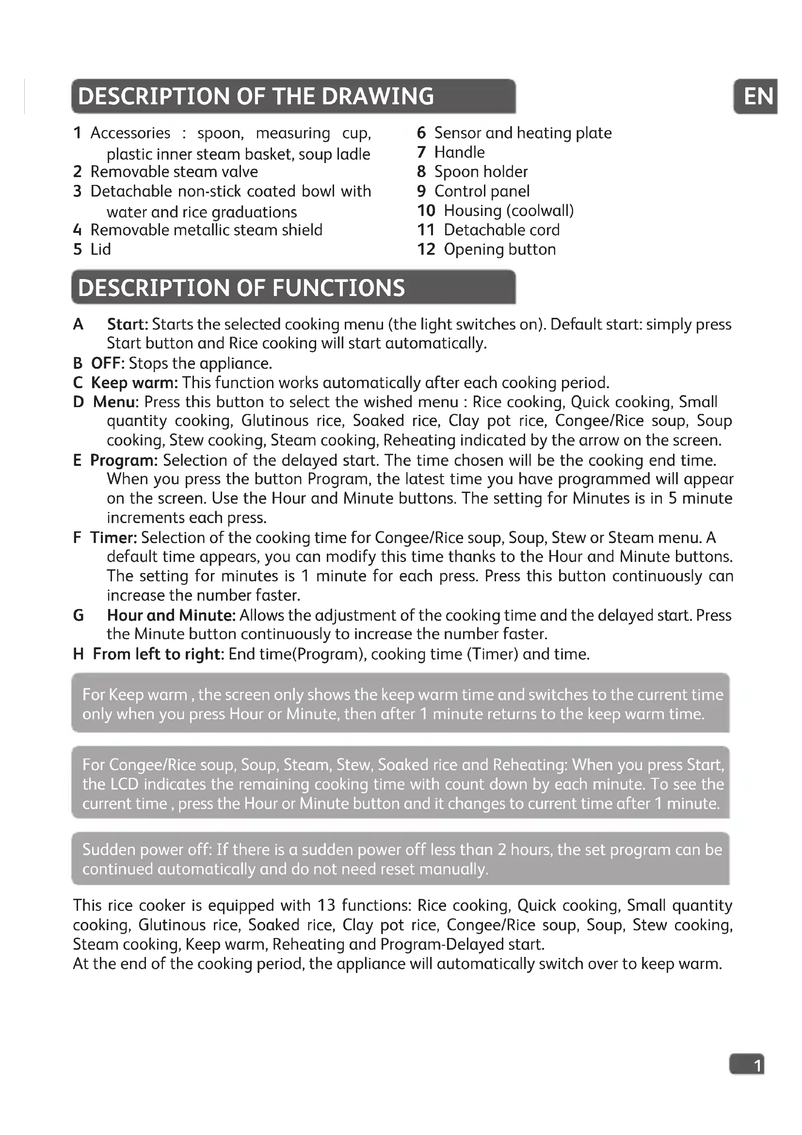 For Keep warm , the screen only shows the keep warm time and switches to the current time only when you press Hour or Minute, then after 1 minute returns to the keep warm time. For Congee/Rice soup, Soup, Steam, Stew, Soaked rice and Reheating: When you press Start, the LCD indicates the remaining cooking time with count down by each minute. To see the current time , press the Hour or Minute button and it changes to current time after 1 minute. Sudden power off: If there is a sudden power off less than 2 hours, the set program can be continued automatically and do not need reset manually. 1 Accessories : spoon, measuring cup, plastic inner steam basket, soup ladle 2 Removable steam valve 3 Detachable non-stick coated bowl with water and rice graduations 4 Removable metallic steam shield 5 Lid 6 Sensor and heating plate 7 Handle 8 Spoon holder 9 Control panel 10 Housing (coolwall) 11 Detachable cord 12 Opening button A Start: Starts the selected cooking menu (the light switches on). Default start: simply press Start button and Rice cooking will start automatically. B OFF: Stops the appliance. C Keep warm: This function works automatically after each cooking period. D Menu: Press this button to select the wished menu : Rice cooking, Quick cooking, Small quantity cooking, Glutinous rice, Soaked rice, Clay pot rice, Congee/Rice soup, Soup cooking, Stew cooking, Steam cooking, Reheating indicated by the arrow on the screen. E Program: Selection of the delayed start. The time chosen will be the cooking end time. When you press the button Program, the latest time you have programmed will appear on the screen. Use the Hour and Minute buttons. The setting for Minutes is in 5 minute increments each press. F Timer: Selection of the cooking time for Congee/Rice soup, Soup, Stew or Steam menu. A default time appears, you can modify this time thanks to the Hour and Minute buttons. The setting for minutes is 1 minute for each press. Press this button continuously can increase the number faster. G Hour and Minute: Allows the adjustment of the cooking time and the delayed start. Press the Minute button continuously to increase the number faster. H From left to right: End time(Program), cooking time (Timer) and time. Stewing Cooking time Time Reheat Time Keep Warm Menu remiTmargorP HourMin tratSffO End timeCookingtimeTime End time Time uneMmraW peeK remiTmargorP HourMin tratSffO Steaming Cooking time Time Keep Warm Menu remiTmargorP Hour Min tratSffO Keep Warm Menu remiTmargorP Hour Min tratSffO