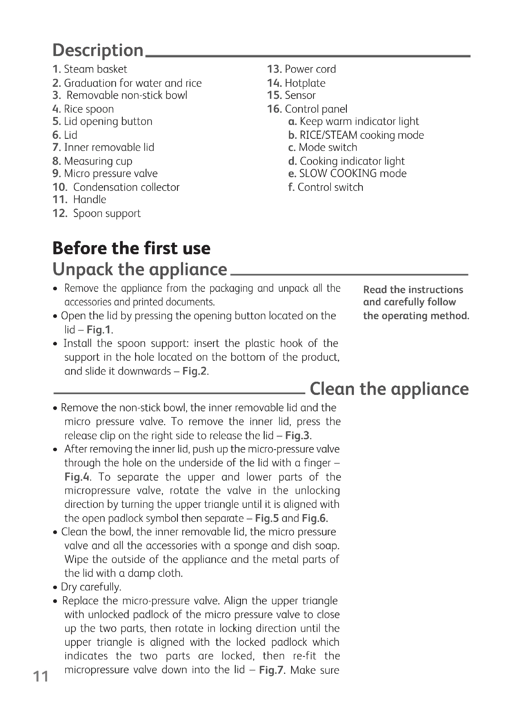 - Replace the micro-pressure valve. Align the upper triangle with unlocked padlock of the micro pressure valve to close up the two parts, then rotate in locking direction until the upper triangle is aligned with the locked padlock which indicates the two parts are locked, then re-fit the micropressure valve down into the lid – Fig.7. Make sure Description Read the instructions and carefully follow the operating method.
