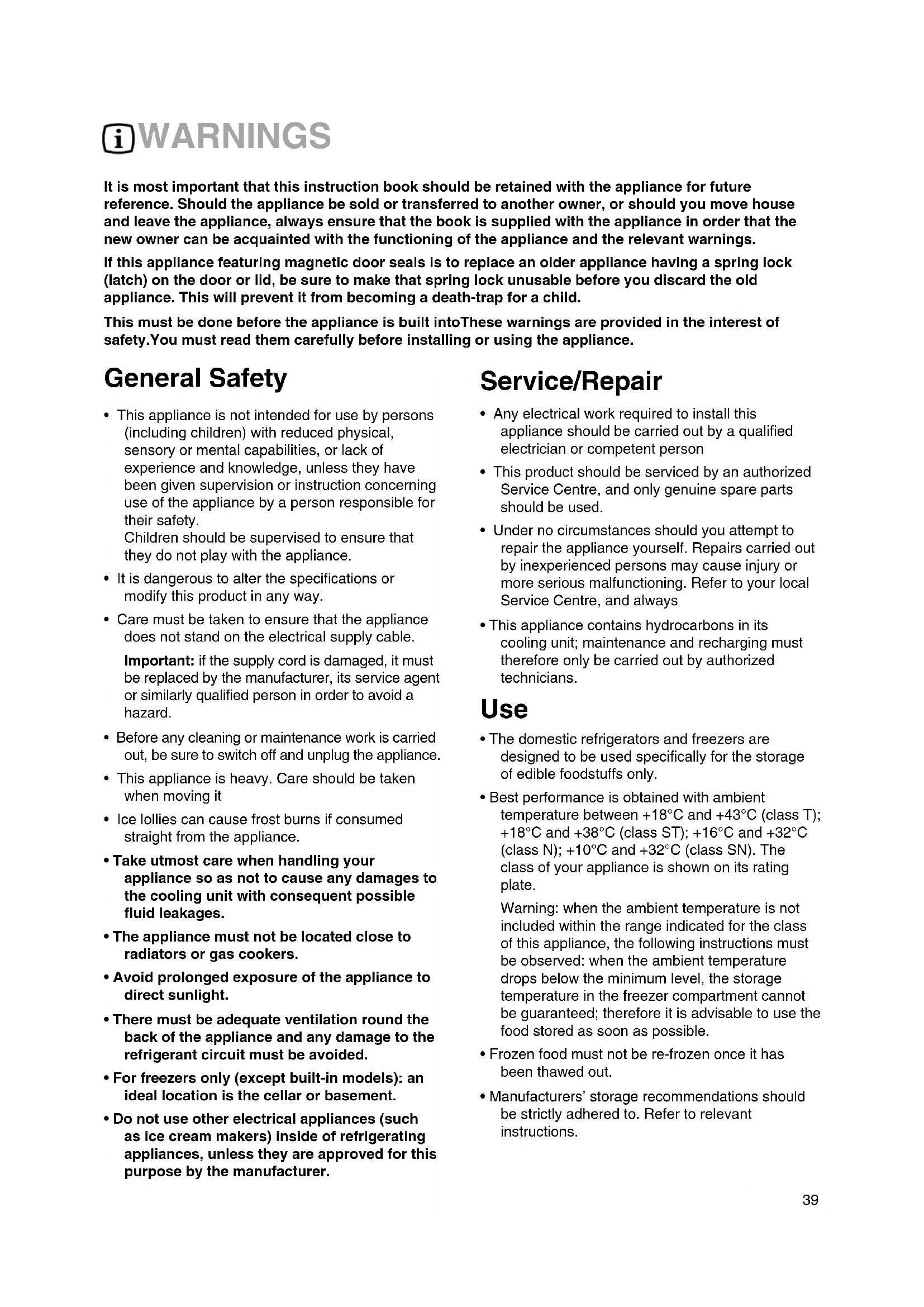 included within the range indicated for the class of this appliance, the following instructions must be observed: when the ambient temperature drops below the minimum level, the storage temperature in the freezer compartment cannot be guaranteed; therefore it is advisable to use the food stored as soon as possible.