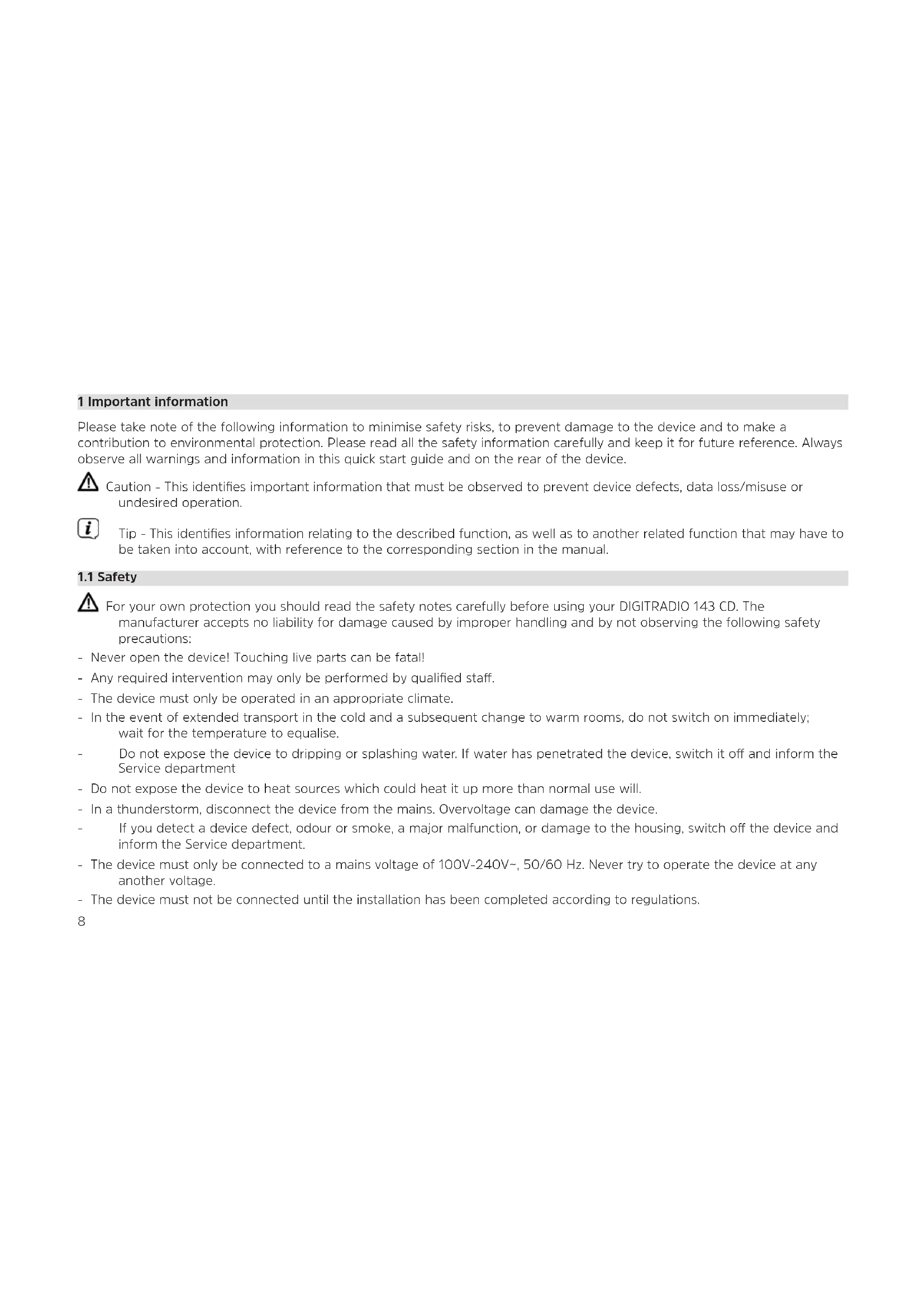 For your own protection you should read the safety notes carefully before using your DIGITRADIO 143 CD. The manufacturer accepts no liability for damage caused by improper handling and by not observing the following safety precautions: - Never open the device! Touching live parts can be fatal! - Any required intervention may only be performed by qualified sta. - The device must only be operated in an appropriate climate. - In the event of extended transport in the cold and a subsequent change to warm rooms, do not switch on immediately; wait for the temperature to equalise. - Do not expose the device to dripping or splashing water. If water has penetrated the device, switch it o and inform the Service department - Do not expose the device to heat sources which could heat it up more than normal use will. - In a thunderstorm, disconnect the device from the mains. Overvoltage can damage the device. - If you detect a device defect, odour or smoke, a major malfunction, or damage to the housing, switch o the device and inform the Service department. - The device must only be connected to a mains voltage of 100V-240V~, 50/60 Hz. Never try to operate the device at any another voltage. - The device must not be connected until the installation has been completed according to regulations.9
