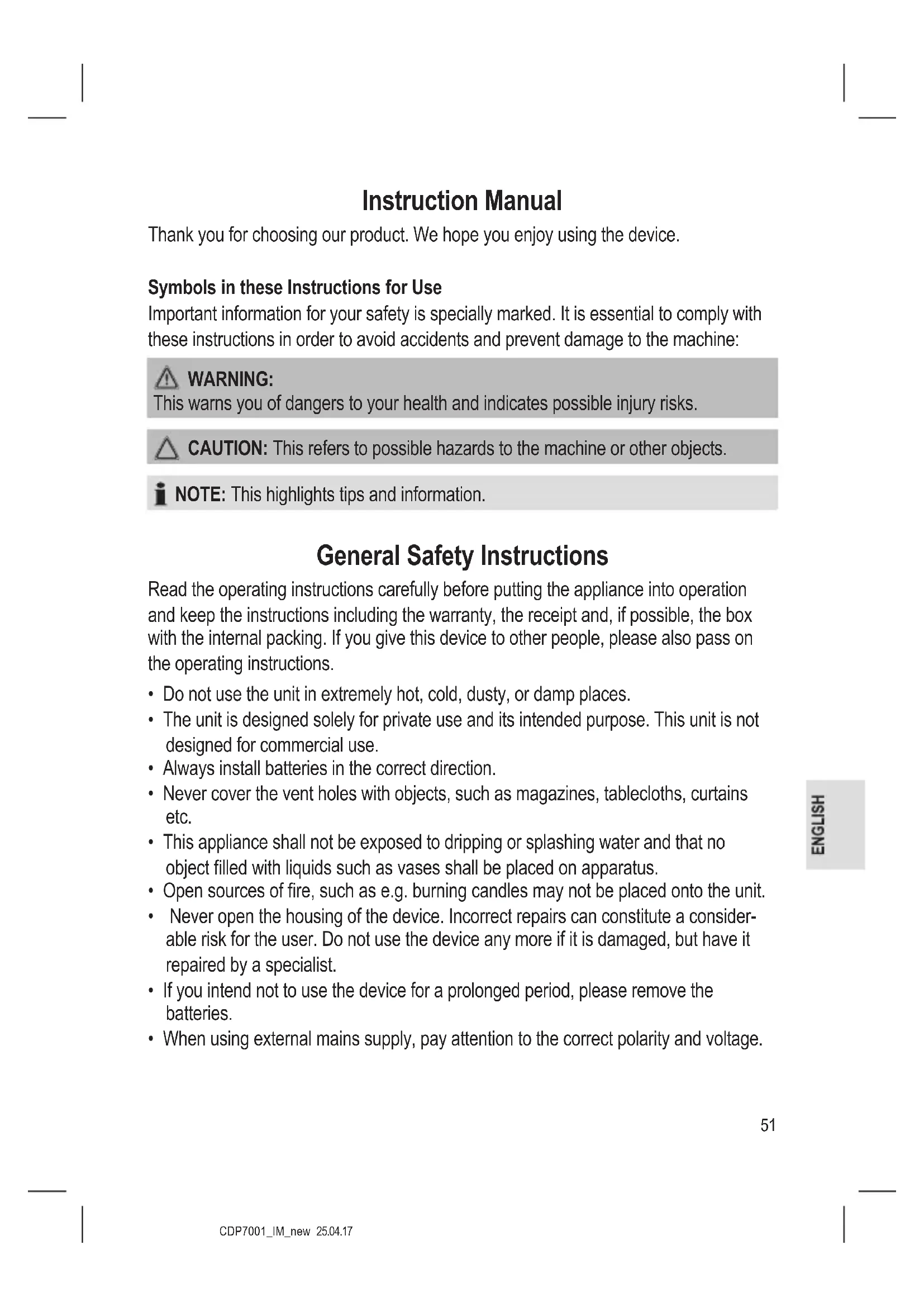 - Polish with a dry, soft cloth. Technical Data Model:.................................................................................................................CDP 7001 Mains adapter: .....................................................4.5 - 5 V DC, 1000 mA, polarity Battery operation: ............................................................................ 2 x 1.5 V, Type R6 / AA Net weight: ...................................................................................................approx. 0.2 kg The right to make technical and design modications in the course of continuous product development remains reserved. This device has been tested according to all relevant current CE guidelines, such as electromagnetic compatibility and low voltage directives, and has been constructed in accordance with the latest safety regulations. Disposal Meaning of the “Dustbin” Symbol Protect our environment: do not dispose of electrical equipment in the domestic waste. Please return any electrical equipment that you will no longer use to the collection points provided for their disposal. This helps avoid the potential effects of incorrect disposal on the environ- ment and human health. This will contribute to the recycling and other forms of re-utilisation of electrical and electronic equipment. Information concerning where the equipment can be disposed of can be obtained from your local authority.CDP7001_IM_new 25.04.17