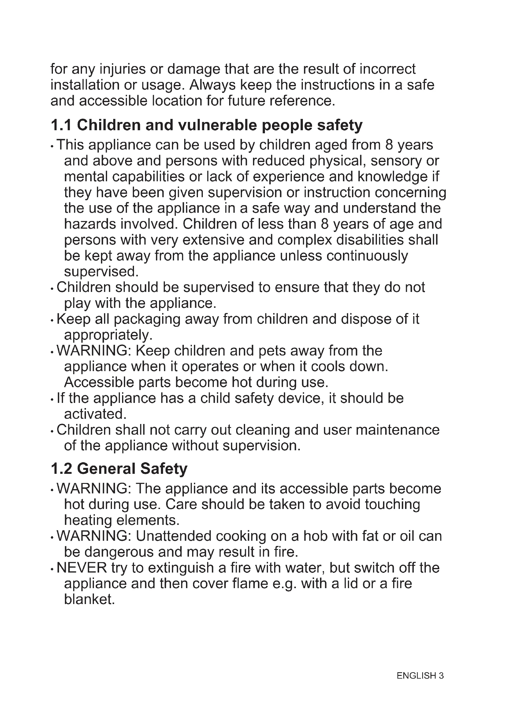 - NEVER try to extinguish a fire with water, but switch off the appliance and then cover flame e.g. with a lid or a fire blanket. ENGLISH 3• WARNING: The appliance must not be supplied through an external switching device, such as a timer, or connected to a circuit that is regularly switched on and off by a utility.