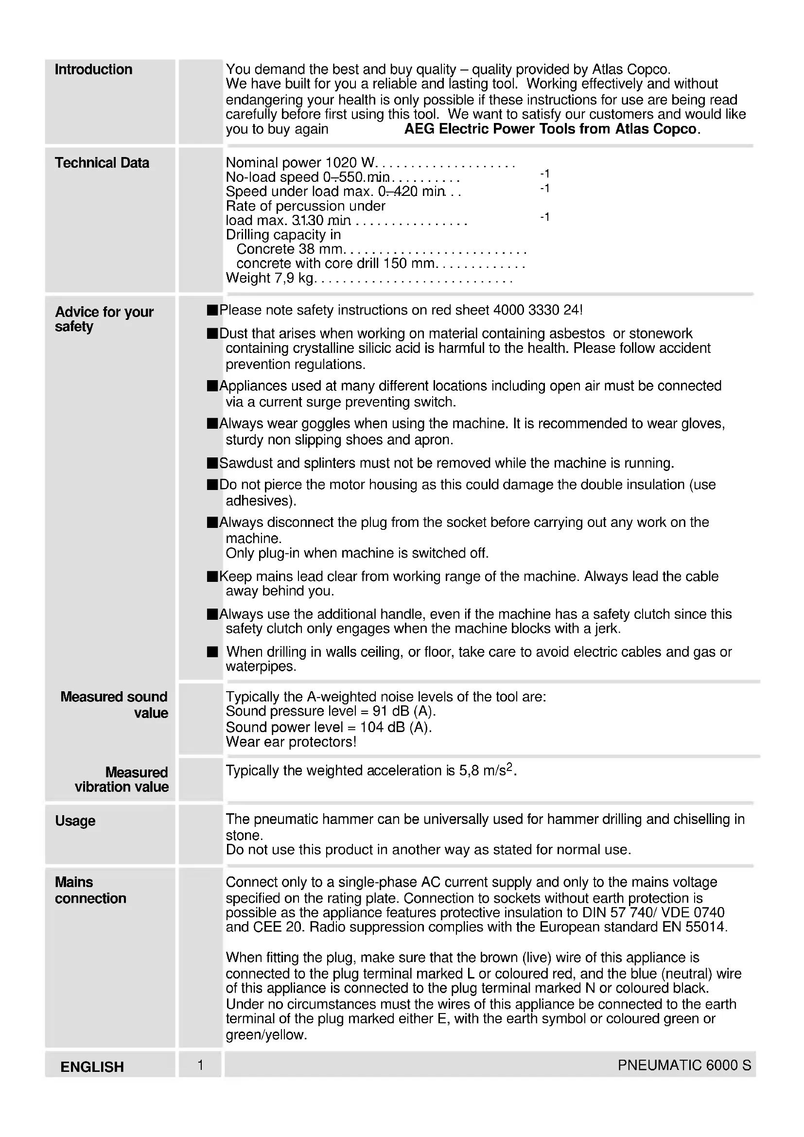 ENGLISH PNEUMATIC 6000 S You demand the best and buy quality – quality provided by Atlas Copco. We have built for you a reliable and lasting tool. Working effectively and without endangering your health is only possible if these instructions for use are being read carefully before first using this tool. We want to satisfy our customers and would like you to buy again AEG Electric Power Tools from Atlas Copco. Nominal power 1020 W. . . . . . . . . . . . . . . . . . . . No-load speed 0–550 min