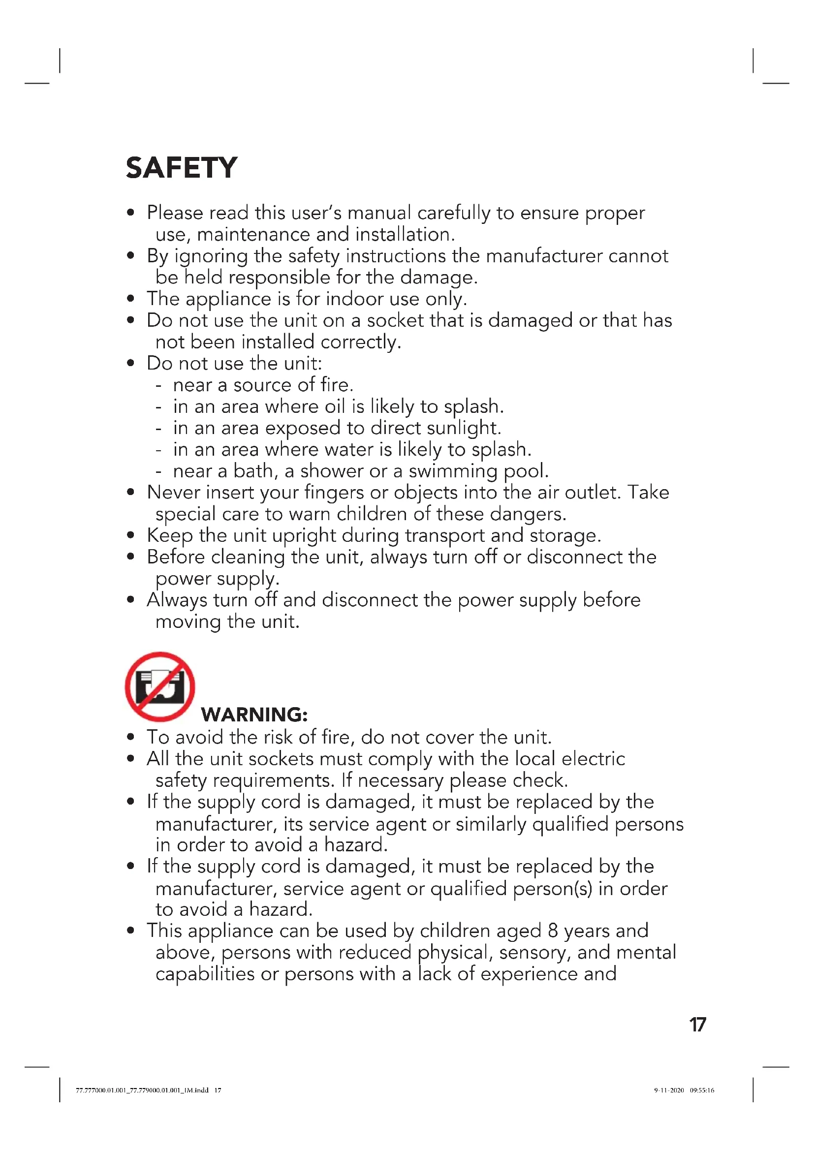 - This appliance can be used by children aged 8 years and above, persons with reduced physical, sensory, and mental capabilities or persons with a lack of experience and 77.777000.01.001_77.779000.01.001_IM.indd 1777.777000.01.001_77.779000.01.001_IM.indd 17 9-11-2020 09:55:169-11-2020 09:55:1618 knowledge if they have been given correct supervision or instruction concerning the use of the appliance in a safe way and understand the hazards involved. Children should not play with the appliance. Cleaning and user maintenance should not be carried out by children without supervision.