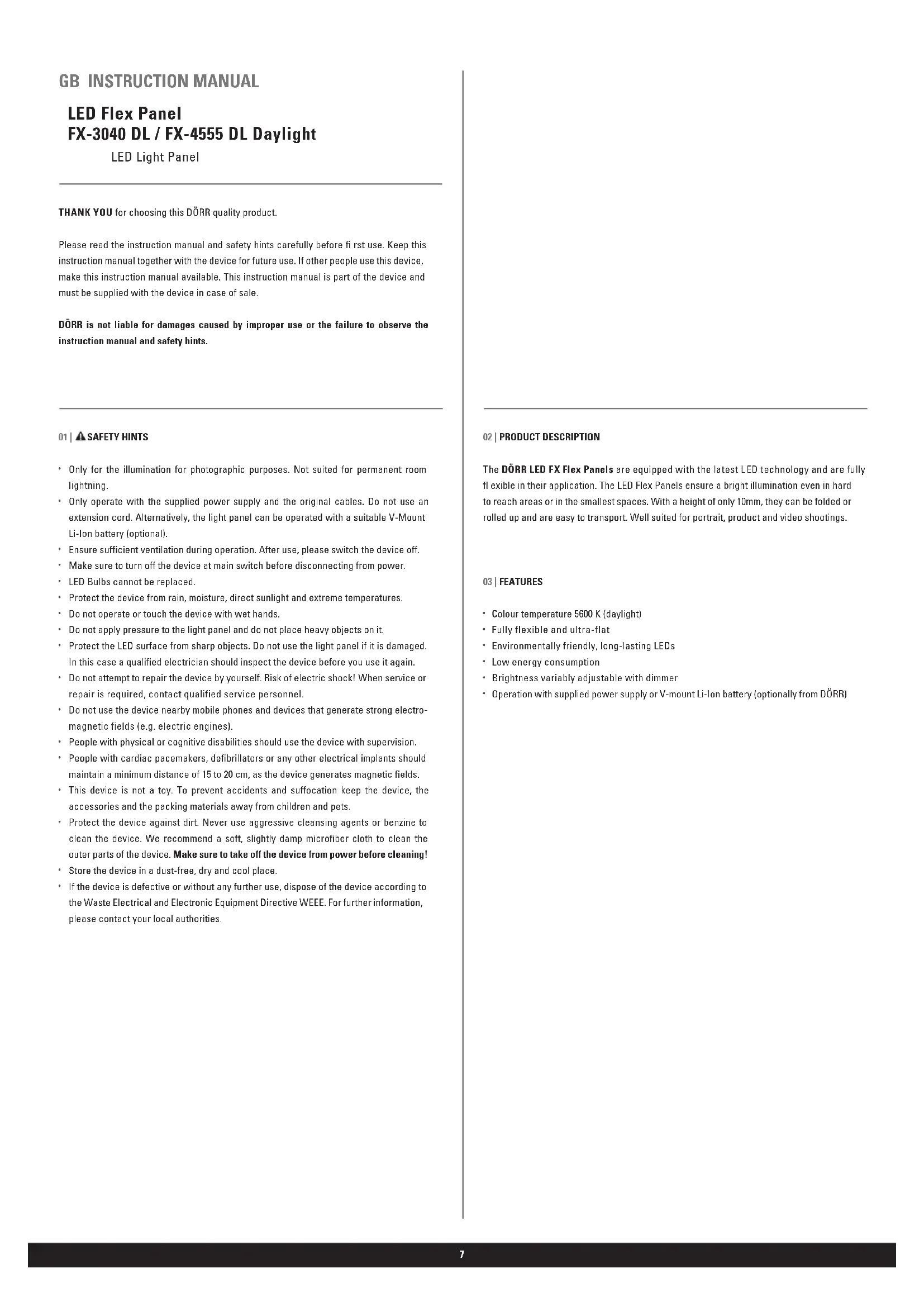 LED Flex Panel FX-3040 DL / FX-4555 DL Daylight LED Light Panel THANK YOU for choosing this DÖRR quality product. Please read the instruction manual and safety hints carefully before fi rst use. Keep this instruction manual together with the device for future use. If other people use this device, make this instruction manual available. This instruction manual is part of the device and must be supplied with the device in case of sale. DÖRR is not liable for damages caused by improper use or the failure to observe the instruction manual and safety hints. 01 | SAFETY HINTS