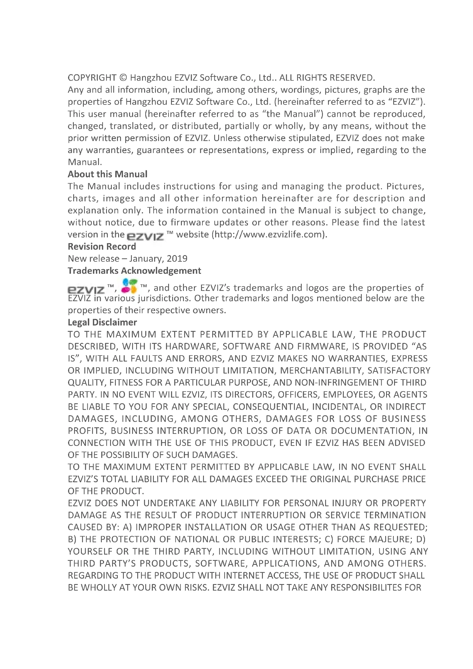 COPYRIGHT © Hangzhou EZVIZ Software Co., Ltd.. ALL RIGHTS RESERVED. Any and all information, including, among others, wordings, pictures, graphs are the properties of Hangzhou EZVIZ Software Co., Ltd. (hereinafter referred to as “EZVIZ”). This user manual (hereinafter referred to as “the Manual”) cannot be reproduced, changed, translated, or distributed, partially or wholly, by any means, without the prior written permission of EZVIZ. Unless otherwise stipulated, EZVIZ does not make any warranties, guarantees or representations, express or implied, regarding to the Manual. About this Manual The Manual includes instructions for using and managing the product. Pictures, charts, images and all other information hereinafter are for description and explanation only. The information contained in the Manual is subject to change, without notice, due to firmware updates or other reasons. Please find the latest version in the ™ website (http://www.ezvizlife.com). Revision Record New release – January, 2019 Trademarks Acknowledgement ™, ™, and other EZVIZ’s trademarks and logos are the properties of EZVIZ in various jurisdictions. Other trademarks and logos mentioned below are the properties of their respective owners. Legal Disclaimer TO THE MAXIMUM EXTENT PERMITTED BY APPLICABLE LAW, THE PRODUCT DESCRIBED, WITH ITS HARDWARE, SOFTWARE AND FIRMWARE, IS PROVIDED “AS IS”, WITH ALL FAULTS AND ERRORS, AND EZVIZ MAKES NO WARRANTIES, EXPRESS OR IMPLIED, INCLUDING WITHOUT LIMITATION, MERCHANTABILITY, SATISFACTORY QUALITY, FITNESS FOR A PARTICULAR PURPOSE, AND NON-INFRINGEMENT OF THIRD PARTY. IN NO EVENT WILL EZVIZ, ITS DIRECTORS, OFFICERS, EMPLOYEES, OR AGENTS BE LIABLE TO YOU FOR ANY SPECIAL, CONSEQUENTIAL, INCIDENTAL, OR INDIRECT DAMAGES, INCLUDING, AMONG OTHERS, DAMAGES FOR LOSS OF BUSINESS PROFITS, BUSINESS INTERRUPTION, OR LOSS OF DATA OR DOCUMENTATION, IN CONNECTION WITH THE USE OF THIS PRODUCT, EVEN IF EZVIZ HAS BEEN ADVISED OF THE POSSIBILITY OF SUCH DAMAGES. TO THE MAXIMUM EXTENT PERMITTED BY APPLICABLE LAW, IN NO EVENT SHALL EZVIZ’S TOTAL LIABILITY FOR ALL DAMAGES EXCEED THE ORIGINAL PURCHASE PRICE OF THE PRODUCT. EZVIZ DOES NOT UNDERTAKE ANY LIABILITY FOR PERSONAL INJURY OR PROPERTY DAMAGE AS THE RESULT OF PRODUCT INTERRUPTION OR SERVICE TERMINATION CAUSED BY: A) IMPROPER INSTALLATION OR USAGE OTHER THAN AS REQUESTED; B) THE PROTECTION OF NATIONAL OR PUBLIC INTERESTS; C) FORCE MAJEURE; D) YOURSELF OR THE THIRD PARTY, INCLUDING WITHOUT LIMITATION, USING ANY THIRD PARTY’S PRODUCTS, SOFTWARE, APPLICATIONS, AND AMONG OTHERS. REGARDING TO THE PRODUCT WITH INTERNET ACCESS, THE USE OF PRODUCT SHALL BE WHOLLY AT YOUR OWN RISKS. EZVIZ SHALL NOT TAKE ANY RESPONSIBILITES FORABNORMAL OPERATION, PRIVACY LEAKAGE OR OTHER DAMAGES RESULTING FROM CYBER ATTACK, HACKER ATTACK, VIRUS INSPECTION, OR OTHER INTERNET SECURITY RISKS; HOWEVER, EZVIZ WILL PROVIDE TIMELY TECHNICAL SUPPORT IF REQUIRED. SURVEILLANCE LAWS AND DATA PROTECTION LAWS VARY BY JURISDICTION. PLEASE CHECK ALL RELEVANT LAWS IN YOUR JURISDICTION BEFORE USING THIS PRODUCT IN ORDER TO ENSURE THAT YOUR USE CONFORMS TO THE APPLICABLE LAW. EZVIZ SHALL NOT BE LIABLE IN THE EVENT THAT THIS PRODUCT IS USED WITH ILLEGITIMATE PURPOSES. IN THE EVENT OF ANY CONFLICTS BETWEEN THE ABOVE AND THE APPLICABLE LAW, THE LATTER PREVAILS. Regulatory Information FCC Information This Camera complies with Part 15 of the FCC Rules. Operation is subject to the following two conditions: (1) This Camera may not cause harmful interference, and (2) This Camera must accept any interference received, including interference that may cause undesired operation. Note: This product has been tested and found to comply with the limits for a Class B digital Camera, pursuant to Part 15 of the FCC Rules. These limits are designed to provide reasonable protection against harmful interference in a residential installation. This product generates, uses, and can radiate radio frequency energy and, if not installed and used in accordance with the instructions, may cause harmful interference to radio communications. However, there is no guarantee that interference will not occur in a particular installation. If this product does cause harmful interference to radio or television reception, which can be determined by turning the equipment off and on, the user is encouraged to try to correct the interference by one or more of the following measures: —Reorient or relocate the receiving antenna. —Increase the separation between the equipment and receiver. —Connect the equipment into an outlet on a circuit different from that to which the receiver is connected. —Consult the dealer or an experienced radio/TV technician for help. Please take attention that changes or modification not expressly approved by the party responsible for compliance could void the user’s authority to operate the equipment. This equipment should be installed and operated with a minimum distance 20cm between the radiator and your body. This Camera complies with Industry Canada licence-exempt RSS standard(s). Operation is subject to the following two conditions: (1) this Camera may not cause interference, and (2) this Camera must accept any interference, including interference that may cause undesired operation of the Camera. Under Industry Canada regulations, this radio transmitter may only operate using anSAVE THIS MANUAL FOR FUTURE REFERENCE