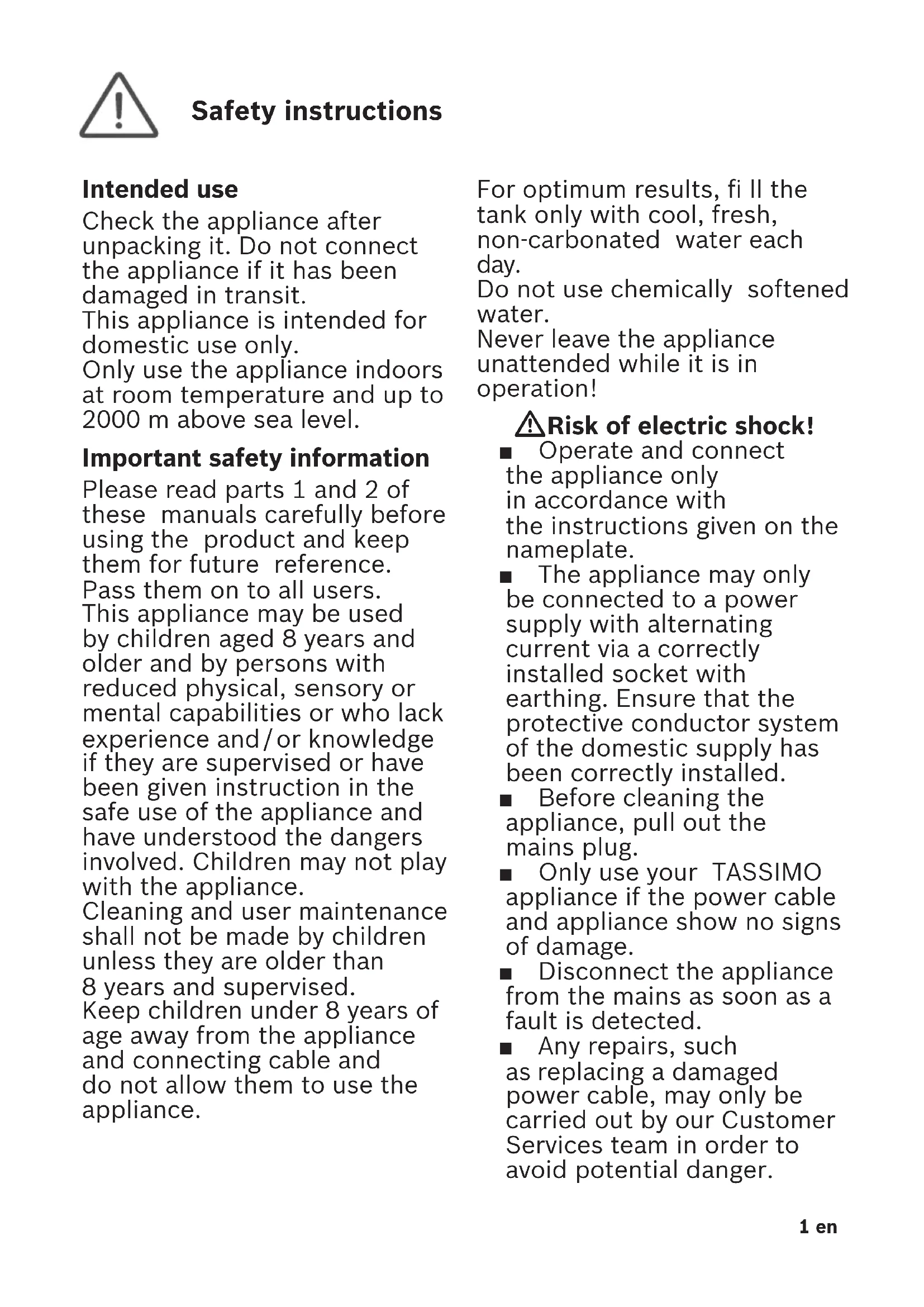 5en Risk of electric shock! de Stromschlaggefahr! fr Risquedechocélectrique ! it Pericolo di scossa elettrica! en Risk of burns! de Verbrennungsgefahr! fr Risquedebrûlure ! it Pericolo di ustioni!1 en Foroptimumresults,llthe tank only with cool, fresh, non-carbonated water each day. Do not use chemically softened water. Never leave the appliance unattended while it is in operation! W Risk of electric shock! ■ Operate and connect the appliance only in accordance with theinstructionsgivenonthe nameplate. ■ The appliance may only be connected to a power supply with alternating current via a correctly installed socket with earthing. Ensure that the protective conductor system of the domestic supply has been correctly installed. ■ Before cleaning the appliance, pull out the mains plug. ■ Only use your TASSIMO appliance if the power cable and appliance show no signs of damage. ■ Disconnect the appliance from the mains as soon as a fault is detected. ■ Any repairs, such as replacingadamaged power cable, may only be carried out by our Customer Services team in order to avoid potential danger. Intended use Check the appliance after unpacking it. Do not connect the appliance if it has been damaged in transit. This appliance is intended for domestic use only. Only use the appliance indoors at room temperature and up to 2000 m above sea level. Important safety information Please read parts 1 and 2 of these manuals carefully before using the product and keep them for future reference. Passthemontoallusers. This appliance may be used by children aged 8 years and older and by persons with reduced physical, sensory or mental capabilities or who lack experienceand / orknowledge if they are supervised or have been given instruction in the safe use of the appliance and have understood the dangers involved. Children may not play with the appliance. Cleaning and user maintenance shall not be made by children unless they are older than 8yearsandsupervised. Keep children under 8 years of age away from the appliance and connecting cable and do not allow them to use the appliance. Safety instructions2en ■ Never immerse the appliance or power cable in water. ■ Avoid spillage on the connector. ■ Please note the special information on cleaning in the instructions. W Risk of burns! ■ Never attempt to open the brewing unit during operation.Pleasenotethat any escaping liquids will beveryhot.TheTDISC, the piercing unit and the beverage outlet may be very hot immediately after brewing.Allowtocoolrst. ■ DonotuseTDISCsthatare damaged. ■ OnlyuseeachTDISConce. ■ After the use the heating element surfaces can be subjected to residual heat. ■ Freshly prepared beverages are very hot. Leave to cool a little if necessary. W Risk of fi re! ■ The appliance gets hot. ■ Never operate the appliance in a cupboard. W Risk of injury! ■ A misuse of the appliance can potentially lead to injury. ■ Under no circumstances you should drink the descaling liquid. W Risk of suff ocation! ■ Do not allow children to play with packaging material. ■ Store small parts safely as they can be easily swallowed. W Caution! ■ Cleaning surfaces which come into contact with foodstuff s! Please note the special information on cleaning in the illustrated instructions. Safety instructions3 en At a glance Before reading on, please unfold the illustrations page at the start of the booklet. 1 Start / Stop button with display elements a Status LED S b Fill water tank R c Descale Q 2 Brewing unit a Lid b TDISCsupport c TDISCpiercingunit d TDISCreadingwindow e Beverage outlet f Splash guard Disposal 3 Removable water tank a max mark b ”Descaling” Q mark c Float 4 Storage compartment a YellowServiceTDISC b Briefcleaning / descaling instructions 5 Cup stand (removable and height adjustable) a Drip grate b Drip tray Dispose of packaging in an environmen- tally-friendly manner. This appliance islabelledinaccordancewithEuropean Directive2012/19/EUconcerningused electrical and electronic appliances (waste electrical and electronic equipment – WEEE). The guideline determines the framework for the returnandrecyclingofusedappliances as applicable throughout the EU. Please ask your specialist retailer about current disposal facilities. Info Bosch is the manufacturer of the TASSIMO machine. Therefore, it cannot provide any delivery guarantee for the TASSIMO T DISCs. TASSIMOTDISCsareavailablefrom specialist retailers. Or visit www.tassimo.com to discover the large variety of beverages available and to order your discs online. Accessories Accessories Order number Webshop Descalingtabs TCZ6004/00311530 www.tassimo.com www.bosch-home.com Yellow ServiceTDISC