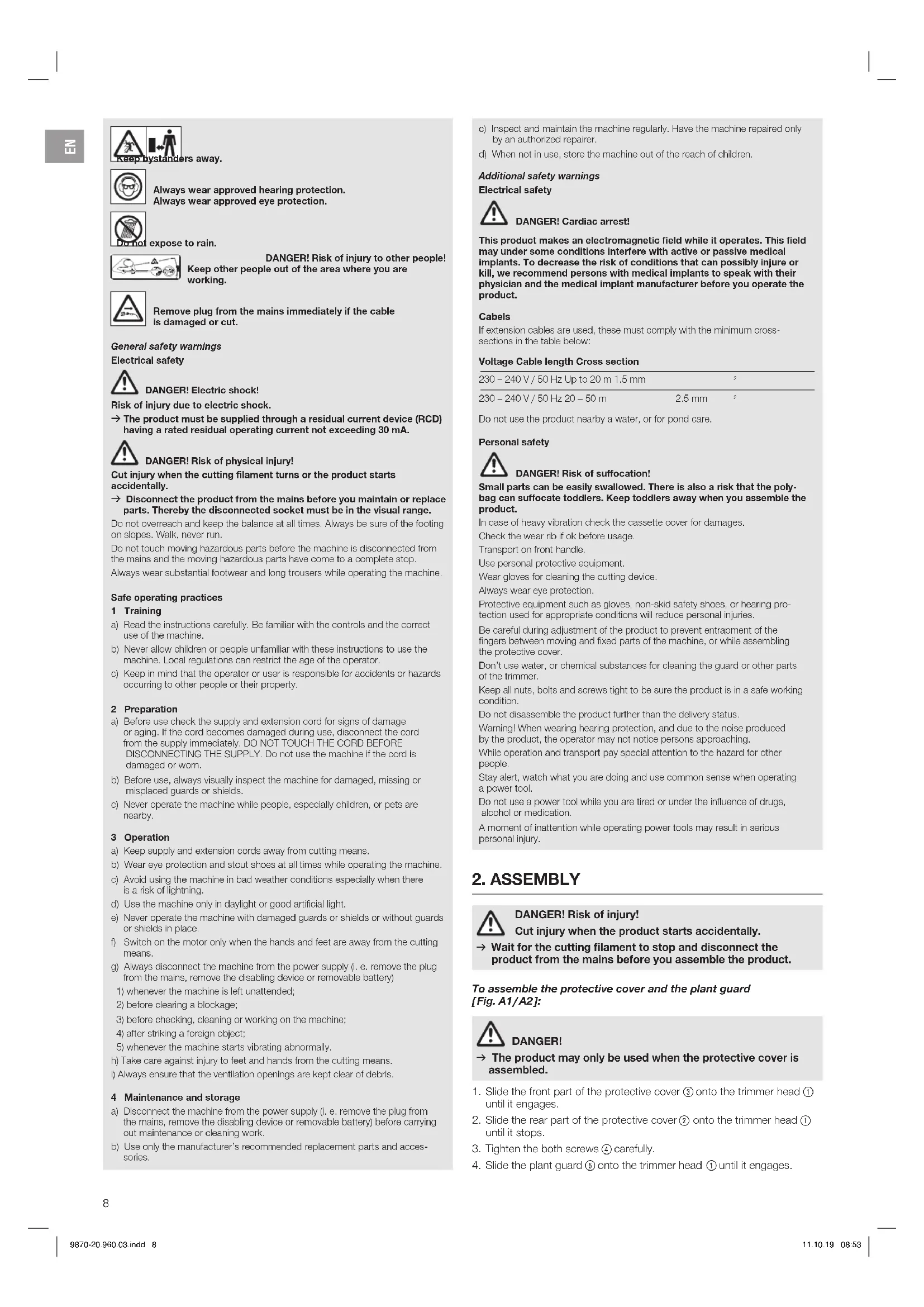 DANGER! Risk of injury! Cut injury when the product starts accidentally. v Wait for the cutting filament to stop and disconnect the product from the mains before you assemble the product. To assemble the protective cover and the plant guard [ Fig. A1 / A2 ]: DANGER! v The product may only be used when the protective cover is assembled.