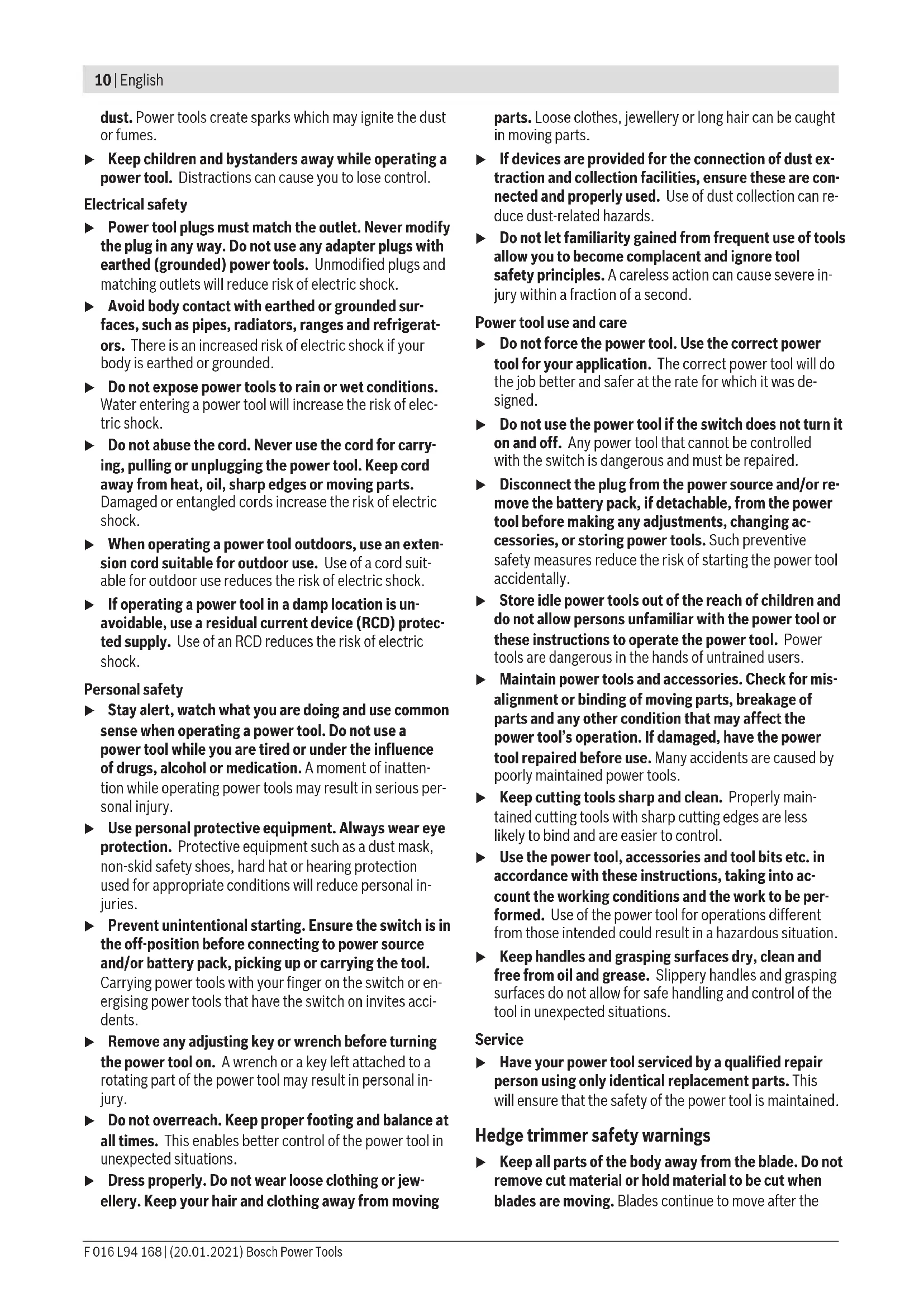 mains before adjusting, cleaning or if cable is cut, damaged or entangled. Your machine is double insulated for safety and requires no earth connection. The operating voltage is 230VAC, 50Hz (for non-EU countries 220V, 240V 50Hz) Contact your Bosch Service Centre for details. If in doubt contact a quali- fied electrician or the nearest Bosch Service Centre. Bosch Power Tools F 016 L94 168 | (20.01.2021)12 | English For increased electrical safety use a Residual Current Device (RCD) with a tripping current of not more than 30mA. Al- ways check your RCD every time you use it. Keep the supply cables away from moving hazardous parts and avoid damage to the cables; this can lead to contact with live parts. The connections (plugs and sockets) should be kept dry and off the ground. The supply cables must be inspected for signs of damage at regular intervals and may only be used if in perfect condi- tion. If the supply cable on the product is damaged, it must only be replaced by a Bosch Service Centre. Only use approved extension cables. Use only extension cords, cables, leads, cable reels that comply with EN 61242/IEC 61242 or IEC 60884-2-7. If you want to use an extension cable when operating your product, only the following cable dimensions should be used: – Nominal conductor area of 1.25mm