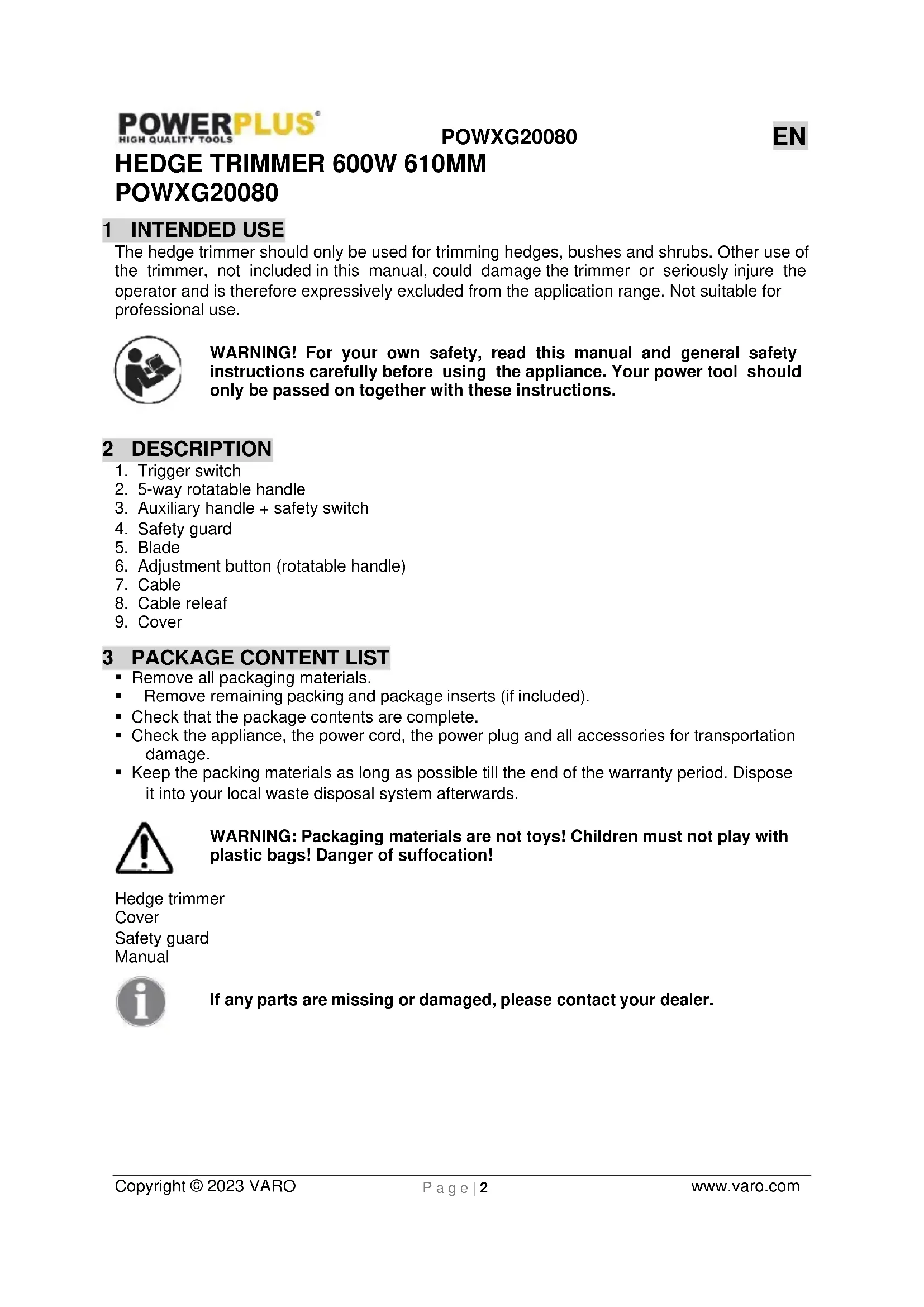 plastic bags! Danger of suffocation! Hedge trimmer Cover Safety guard Manual If any parts are missing or damaged, please contact your dealer.EN POWXG20080 Copyright © 2023 VARO www.varo.com P a g e | 3