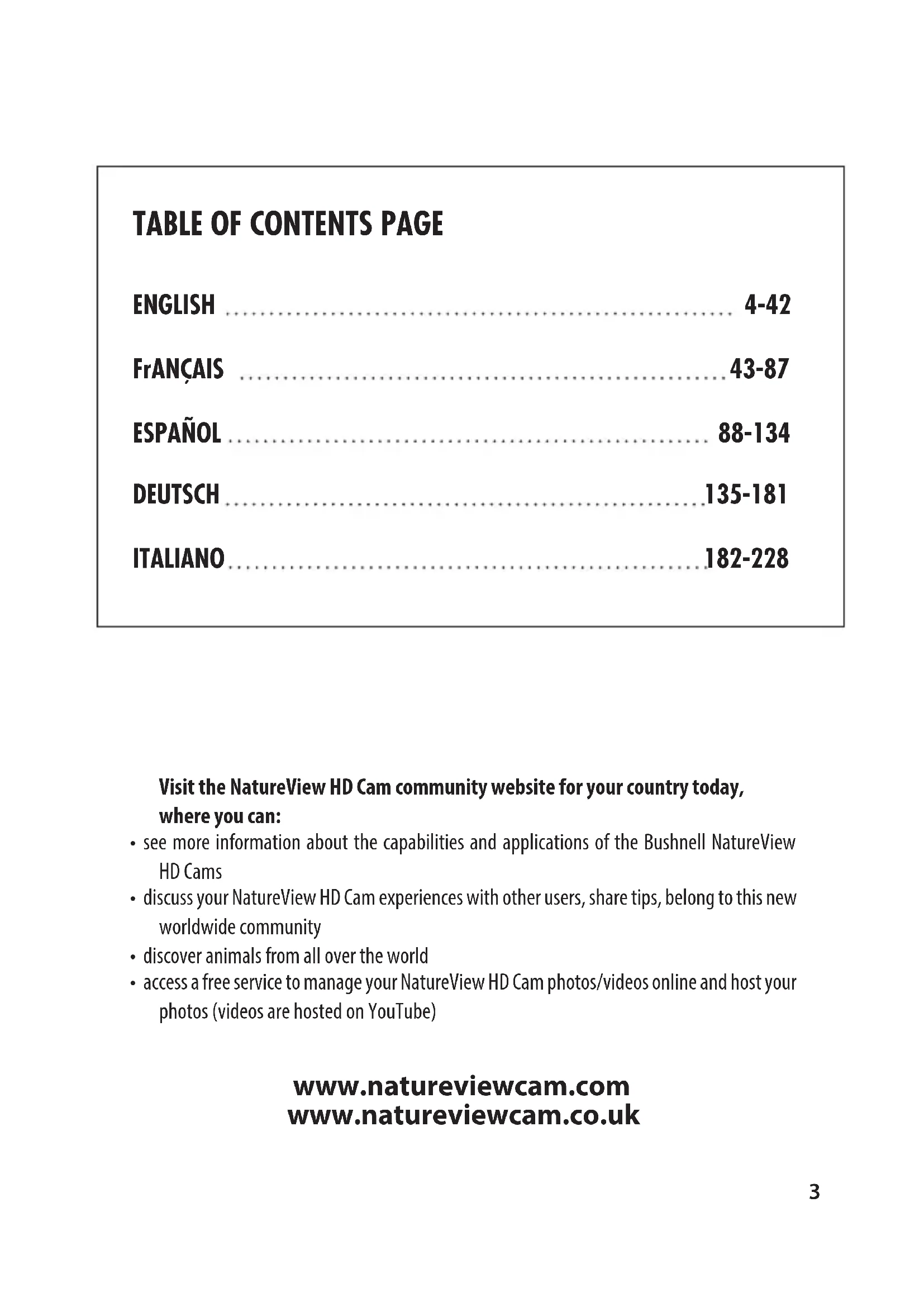 ENGLISH FrANçAIS ESPAñOL DEuTSCH ITALIANO 4-42 43-87 88-134 135-181 182-228 Visit the NatureView HD Cam community website for your country today, where you can: