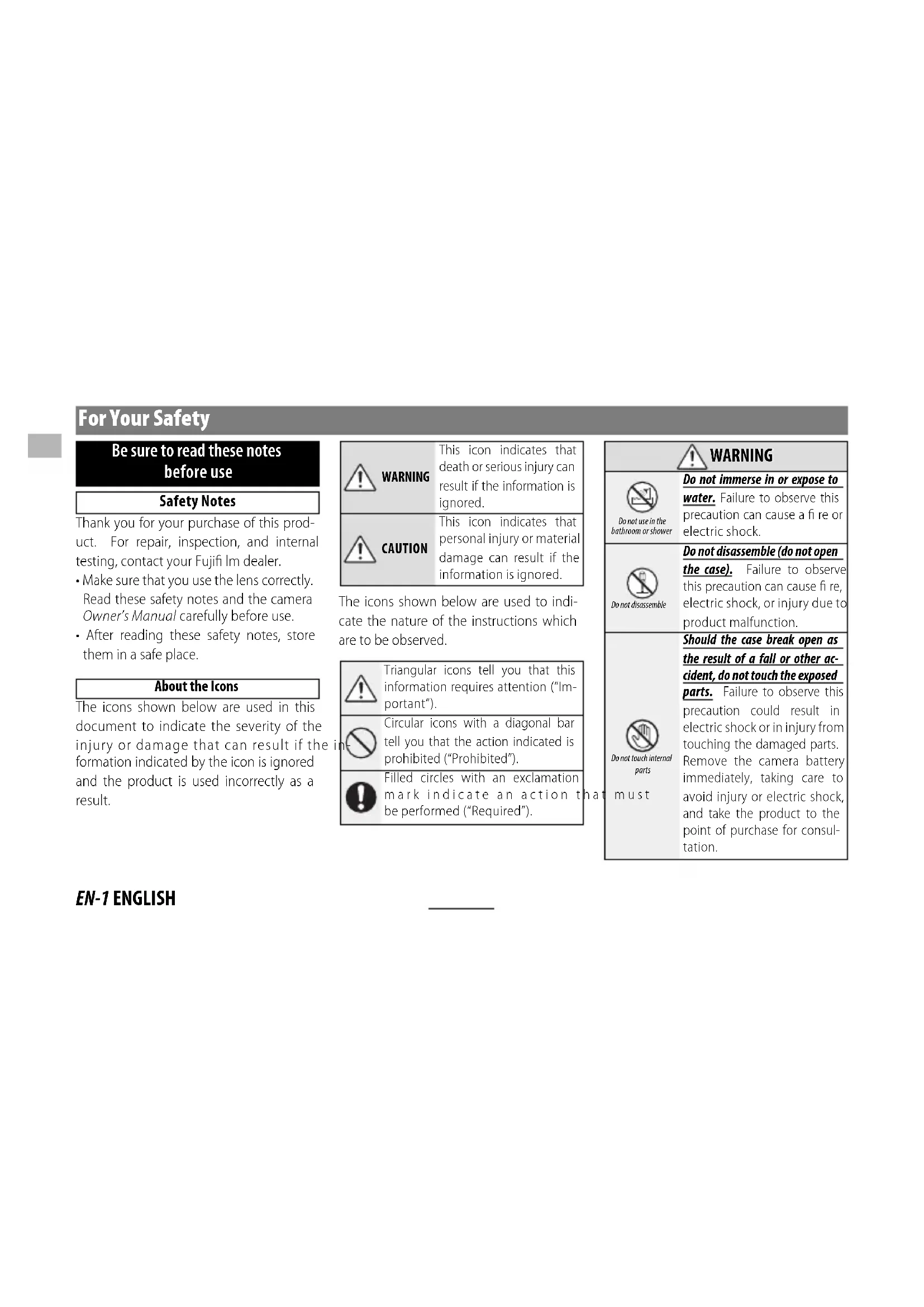 - After reading these safety notes, store them in a safe place. About the Icons The icons shown below are used in this document to indicate the severity of the injury or damage that can result if the in- formation indicated by the icon is ignored and the product is used incorrectly as a result. WARNINGThis icon indicates that death or serious injury can result if the information is ignored.CAUTIONThis icon indicates that personal injury or material damage can result if the information is ignored. The icons shown below are used to indi- cate the nature of the instructions which are to be observed. Triangular icons tell you that this information requires attention (“Im-portant”).Circular icons with a diagonal bar tell you that the action indicated is prohibited (“Prohibited”).Filled circles with an exclamation mark indicate an action that must be performed (“Required”). WARNING WARNING Do not use in the bathroom or showerDo not immerse in or expose to water. Failure to observe this precaution can cause a fi re or electric shock.Do not disassembleDo not disassemble (do not open the case). Failure to observe this precaution can cause fi re, electric shock, or injury due to product malfunction.Do not touch internal partsShould the case break open as the result of a fall or other ac-cident, do not touch the exposed parts. Failure to observe this precaution could result in electric shock or in injury from touching the damaged parts. Remove the camera battery immediately, taking care to avoid injury or electric shock, and take the product to the point of purchase for consul-tation.EN-2ENGLISH WARNING WARNING Do not place on unstable sur- faces. The product may fall, causing injury. Do not view the sun through the lens or camera view nders. Failure to observe this precau- tion can cause permanent visual impairment. CAUTION CAUTION Do not use or store in locations that are exposed to steam, or smoke or are very humid or extremely dusty. Failure to observe this precaution can cause fi re or electric shock. Do not leave in direct sunlight or in locations subject to very high temperatures, such as in a closed vehicle on a sunny day. Failure to observe this precau- tion can cause fi re. CAUTION CAUTION Keep out of the reach of small children. This product could cause injury in the hands of a child. Do not handle with wet hands. Failure to observe this precau- tion can cause electric shock. Keep the sun out of the frame when shooting backlit subjects. Sunlight focused into the camera when the sun is in or close to the frame can cause fi r e o r b u r n s . When the product is not in use, replace the lens caps and store out of direct sunlight. Sunlight focused by the lens can cause fi r e o r b u r n s . Do not carry the camera or lens while they are attached to a tripod. The product can fall or strike other objects, caus- ing injury. For Customers in the U. S. A. For Customers in the U. S. A. Tested To Comply With FCC Standards