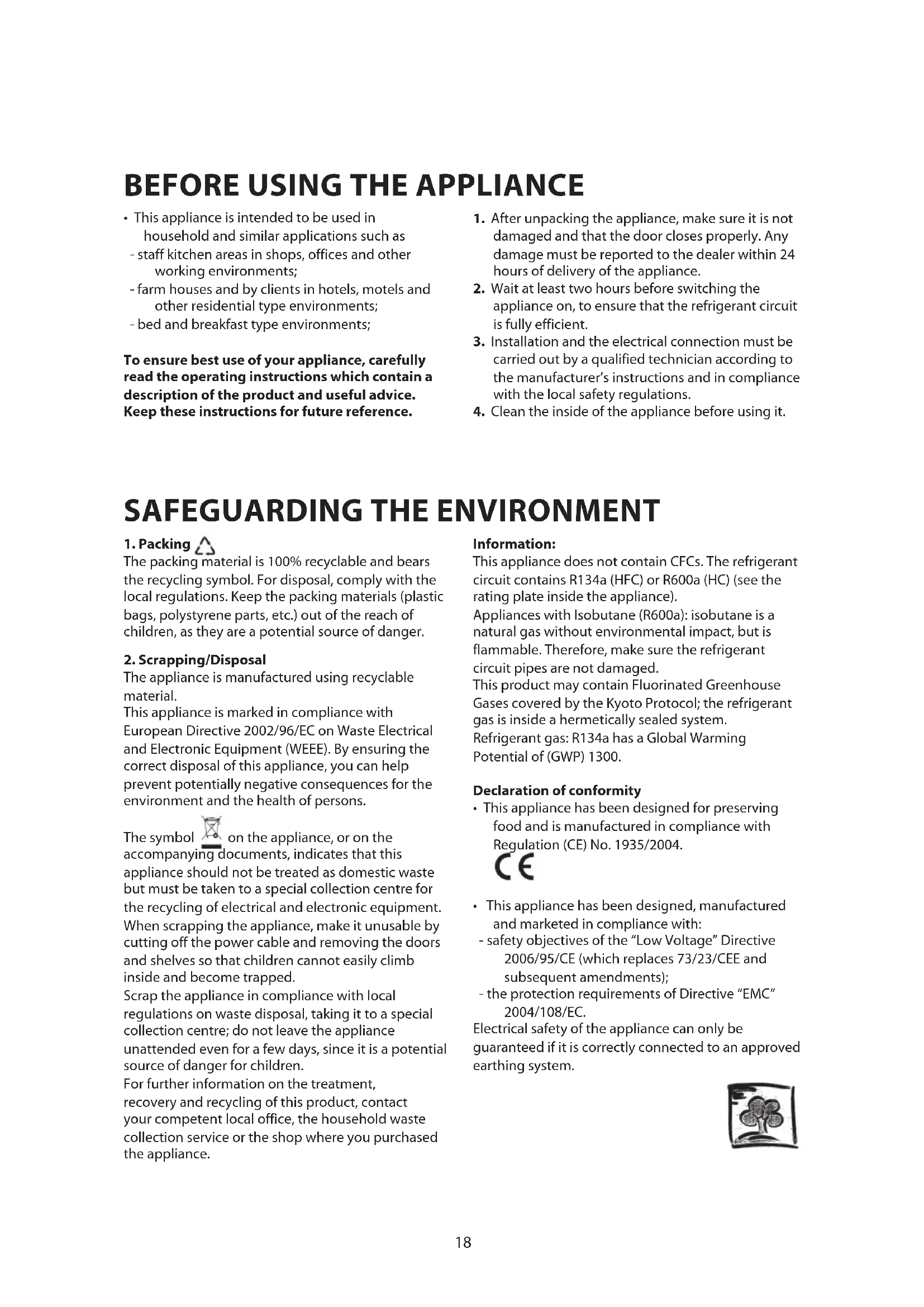 The appliance is manufactured using recyclable material. This appliance is marked in compliance with European Directive 2002/96/EC on Waste Electrical and Electronic Equipment (WEEE). By ensuring the correct disposal of this appliance, you can help prevent potentially negative consequences for the environment and the health of persons. The symbol on the appliance, or on the accompanying documents, indicates that this appliance should not be treated as domestic waste but must be taken to a special collection centre for the recycling of electrical and electronic equipment. When scrapping the appliance, make it unusable by cutting off the power cable and removing the doors and shelves so that children cannot easily climb inside and become trapped. Scrap the appliance in compliance with local regulations on waste disposal, taking it to a special collection centre; do not leave the appliance unattended even for a few days, since it is a potential source of danger for children. For further information on the treatment, recovery and recycling of this product, contact your competent local office, the household waste collection service or the shop where you purchased the appliance. Information: This appliance does not contain CFCs. The refrigerant circuit contains R134a (HFC) or R600a (HC) (see the rating plate inside the appliance). Appliances with Isobutane (R600a): isobutane is a natural gas without environmental impact, but is flammable. Therefore, make sure the refrigerant circuit pipes are not damaged. This product may contain Fluorinated Greenhouse Gases covered by the Kyoto Protocol; the refrigerant gas is inside a hermetically sealed system. Refrigerant gas: R134a has a Global Warming Potential of (GWP) 1300. Declaration of conformity