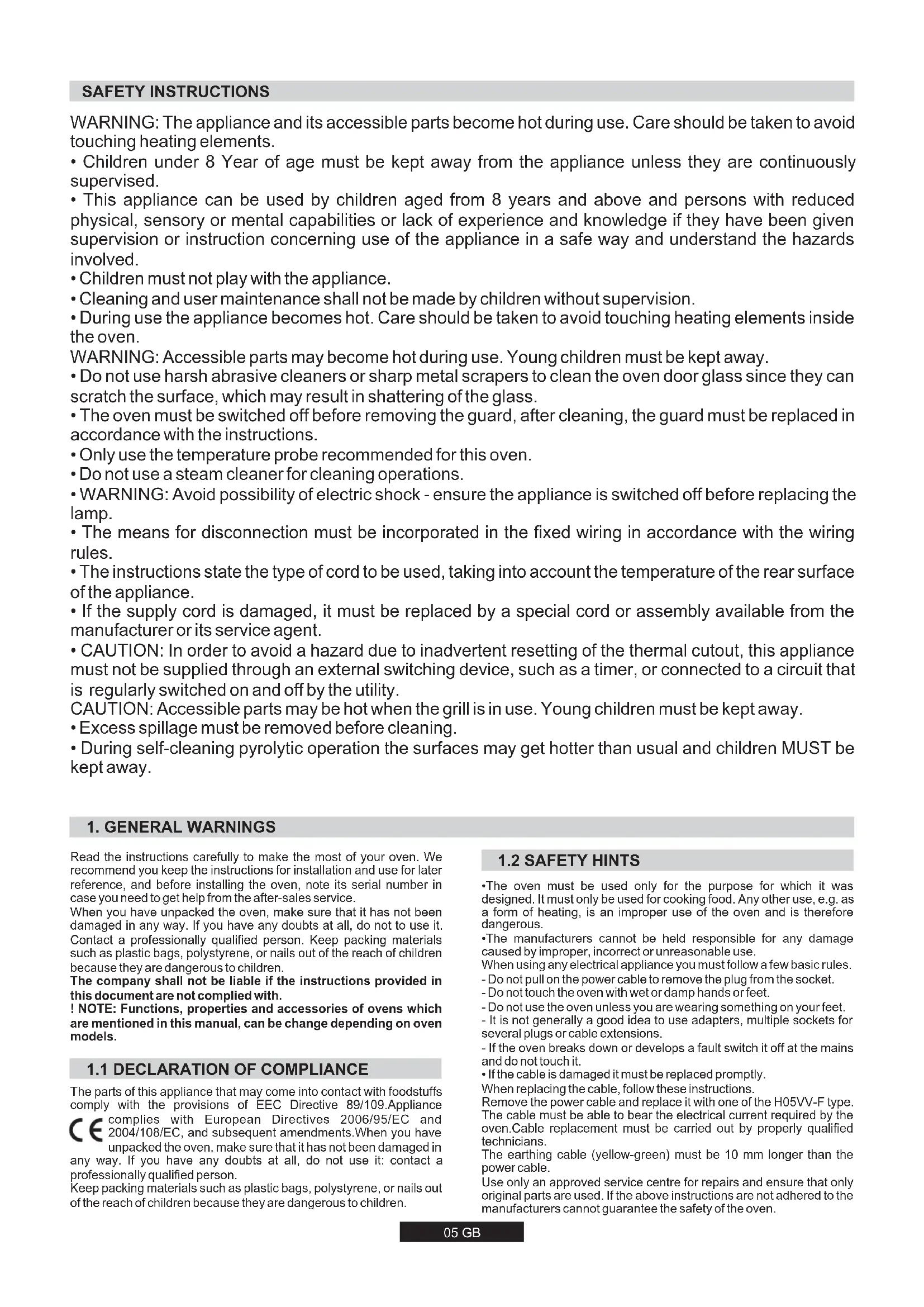 - During self-cleaning pyrolytic operation the surfaces may get hotter than usual and children MUST be kept away. SAFETY INSTRUCTIONS 05 GB