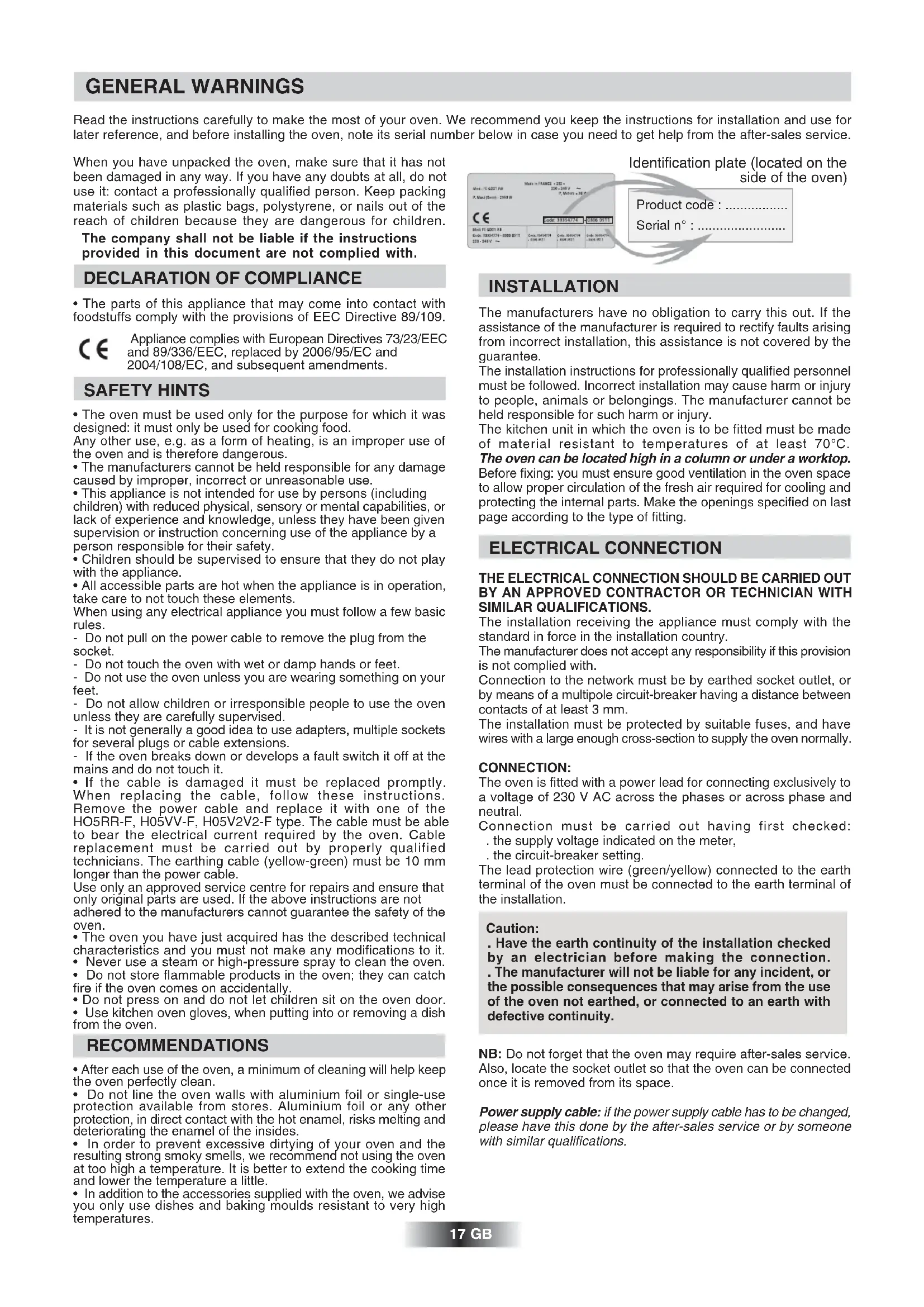 - After each use of the oven, a minimum of cleaning will help keepthe oven perfectly clean.• Do not line the oven walls with aluminium foil or single-useprotection available from stores. Aluminium foil or any otherprotection, in direct contact with the hot enamel, risks melting anddeteriorating the enamel of the insides.• In order to prevent excessive dirtying of your oven and theresulting strong smoky smells, we recommend not using the ovenat too high a temperature. It is better to extend the cooking timeand lower the temperature a little.• In addition to the accessories supplied with the oven, we adviseyou only use dishes and baking moulds resistant to very hightemperatures. INSTALLATION The manufacturers have no obligation to carry this out. If theassistance of the manufacturer is required to rectify faults arisingfrom incorrect installation, this assistance is not covered by theguarantee.The installation instructions for professionally qualified personnelmust be followed. Incorrect installation may cause harm or injuryto people, animals or belongings. The manufacturer cannot beheld responsible for such harm or injury.The kitchen unit in which the oven is to be fitted must be madeof material resistant to temperatures of at least 70°C. The oven can be located high in a column or under a worktop. Before fixing: you must ensure good ventilation in the oven spaceto allow proper circulation of the fresh air required for cooling andprotecting the internal parts. Make the openings specified on lastpage according to the type of fitting. ELECTRICAL CONNECTION THE ELECTRICAL CONNECTION SHOULD BE CARRIED OUTBY AN APPROVED CONTRACTOR OR TECHNICIAN WITHSIMILAR QUALIFICATIONS.The installation receiving the appliance must comply with thestandard in force in the installation country.The manufacturer does not accept any responsibility if this provisionis not complied with.Connection to the network must be by earthed socket outlet, orby means of a multipole circuit-breaker having a distance betweencontacts of at least 3 mm.The installation must be protected by suitable fuses, and havewires with a large enough cross-section to supply the oven normally.CONNECTION:The oven is fitted with a power lead for connecting exclusively toa voltage of 230 V AC across the phases or across phase andneutral.Connection must be carried out having first checked: . the supply voltage indicated on the meter, . the circuit-breaker setting.The lead protection wire (green/yellow) connected to the earthterminal of the oven must be connected to the earth terminal ofthe installation. Caution:. Have the earth continuity of the installation checkedby an electrician before making the connection.. The manufacturer will not be liable for any incident, orthe possible consequences that may arise from the useof the oven not earthed, or connected to an earth withdefective continuity.NB: Do not forget that the oven may require after-sales service.Also, locate the socket outlet so that the oven can be connectedonce it is removed from its space. Power supply cable: if the power supply cable has to be changed, please have this done by the after-sales service or by someone with similar qualifications. 17 GB Identification plate (located on the side of the oven) Product code : ................. Serial n° : ........................18 GB
