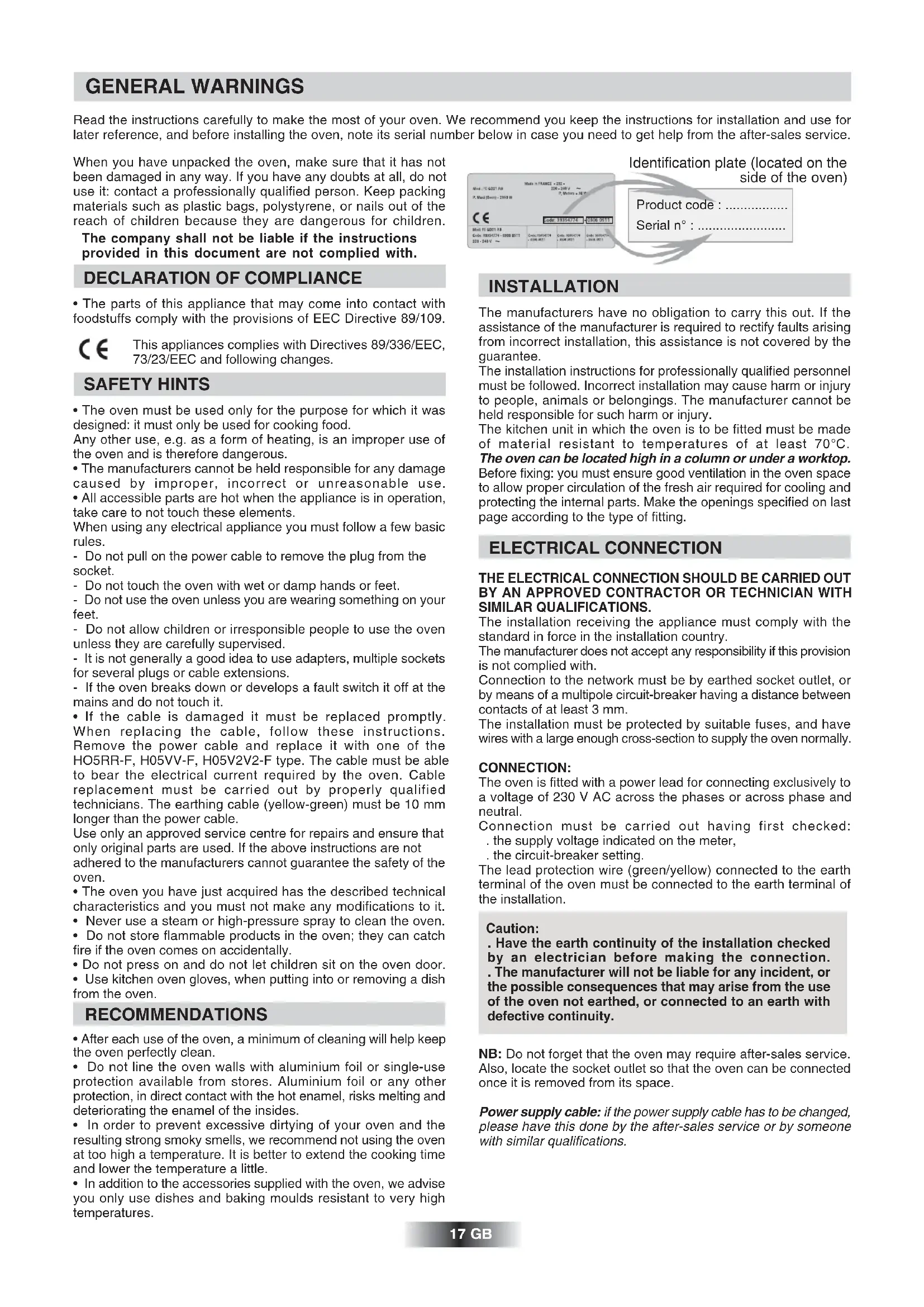 - After each use of the oven, a minimum of cleaning will help keepthe oven perfectly clean.• Do not line the oven walls with aluminium foil or single-useprotection available from stores. Aluminium foil or any otherprotection, in direct contact with the hot enamel, risks melting anddeteriorating the enamel of the insides.• In order to prevent excessive dirtying of your oven and theresulting strong smoky smells, we recommend not using the ovenat too high a temperature. It is better to extend the cooking timeand lower the temperature a little.• In addition to the accessories supplied with the oven, we adviseyou only use dishes and baking moulds resistant to very hightemperatures. INSTALLATION The manufacturers have no obligation to carry this out. If theassistance of the manufacturer is required to rectify faults arisingfrom incorrect installation, this assistance is not covered by theguarantee.The installation instructions for professionally qualified personnelmust be followed. Incorrect installation may cause harm or injuryto people, animals or belongings. The manufacturer cannot beheld responsible for such harm or injury.The kitchen unit in which the oven is to be fitted must be madeof material resistant to temperatures of at least 70°C. The oven can be located high in a column or under a worktop. Before fixing: you must ensure good ventilation in the oven spaceto allow proper circulation of the fresh air required for cooling andprotecting the internal parts. Make the openings specified on lastpage according to the type of fitting. ELECTRICAL CONNECTION THE ELECTRICAL CONNECTION SHOULD BE CARRIED OUTBY AN APPROVED CONTRACTOR OR TECHNICIAN WITHSIMILAR QUALIFICATIONS.The installation receiving the appliance must comply with thestandard in force in the installation country.The manufacturer does not accept any responsibility if this provisionis not complied with.Connection to the network must be by earthed socket outlet, orby means of a multipole circuit-breaker having a distance betweencontacts of at least 3 mm.The installation must be protected by suitable fuses, and havewires with a large enough cross-section to supply the oven normally.CONNECTION:The oven is fitted with a power lead for connecting exclusively toa voltage of 230 V AC across the phases or across phase andneutral.Connection must be carried out having first checked: . the supply voltage indicated on the meter, . the circuit-breaker setting.The lead protection wire (green/yellow) connected to the earthterminal of the oven must be connected to the earth terminal ofthe installation. Caution:. Have the earth continuity of the installation checkedby an electrician before making the connection.. The manufacturer will not be liable for any incident, orthe possible consequences that may arise from the useof the oven not earthed, or connected to an earth withdefective continuity.NB: Do not forget that the oven may require after-sales service.Also, locate the socket outlet so that the oven can be connectedonce it is removed from its space. Power supply cable: if the power supply cable has to be changed, please have this done by the after-sales service or by someone with similar qualifications. 17 GB Identification plate (located on the side of the oven) Product code : ................. Serial n° : ........................18 GB
