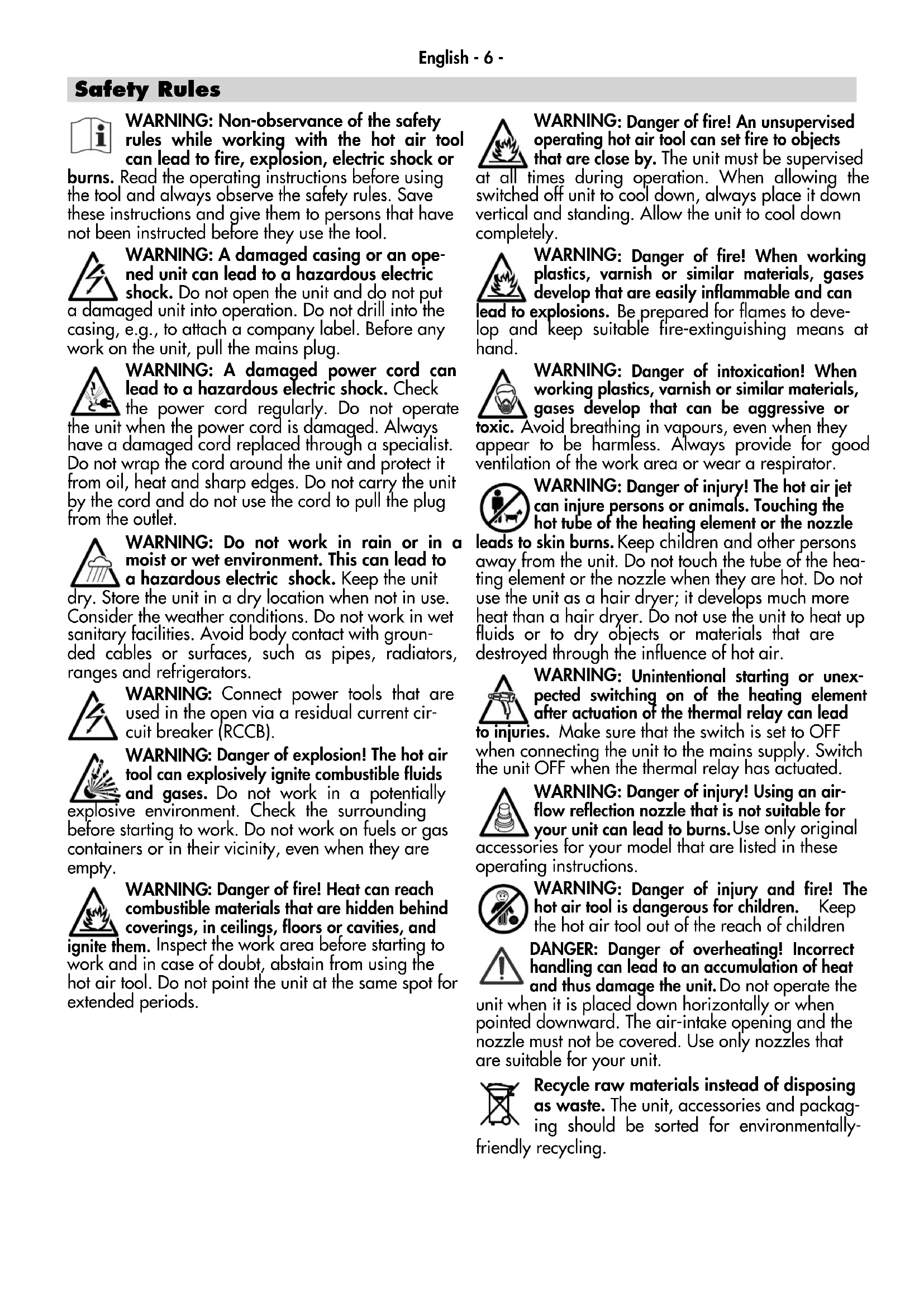 handling can lead to an accumulation of heat and thus damage the unit. Do not operate the unit when it is placed down horizontally or when pointed downward. The air-intake opening and the nozzle must not be covered. Use only nozzles that are suitable for your unit. Recycle raw materials instead of disposing as waste. The unit, accessories and packag- ing should be sorted for environmentally- friendly recycling. Safety RulesEnglish - 7 -