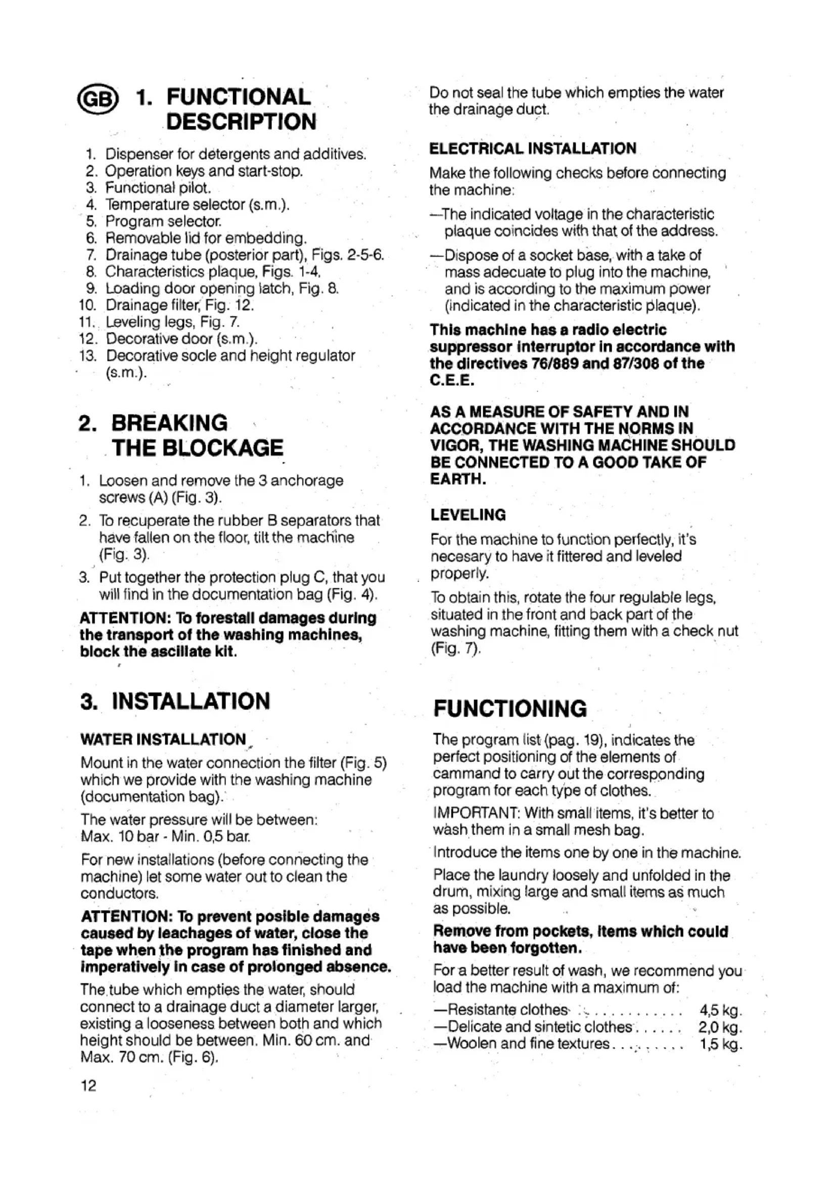BE CONNECTED TO A GOOD TAKE OF EARTH. LEVELING For the machine to function perfectly, it’s necesary to have it tittered and leveled properly. To obtain this, rotate the four regulable legs, situated in the front and back part of the washing machine, fitting them with a check nut (Fig. 7). FUNCTIONING The program list (pag. 19), indicates the perfect positioning of the elements of cammand to carry out the corresponding program for each type of clothes. IMPORTANT: With small items, it’s better to wash them in a small mesh bag. Introduce the items one by one in the machine. Place the laundry loosely and unfolded in the drum, mixing large and small items as much as possible. Remove from pockets, items which could have been forgotten. For a better result of wash, we recommend you load the machine with a maximum of: —Résistante clothes-:-,