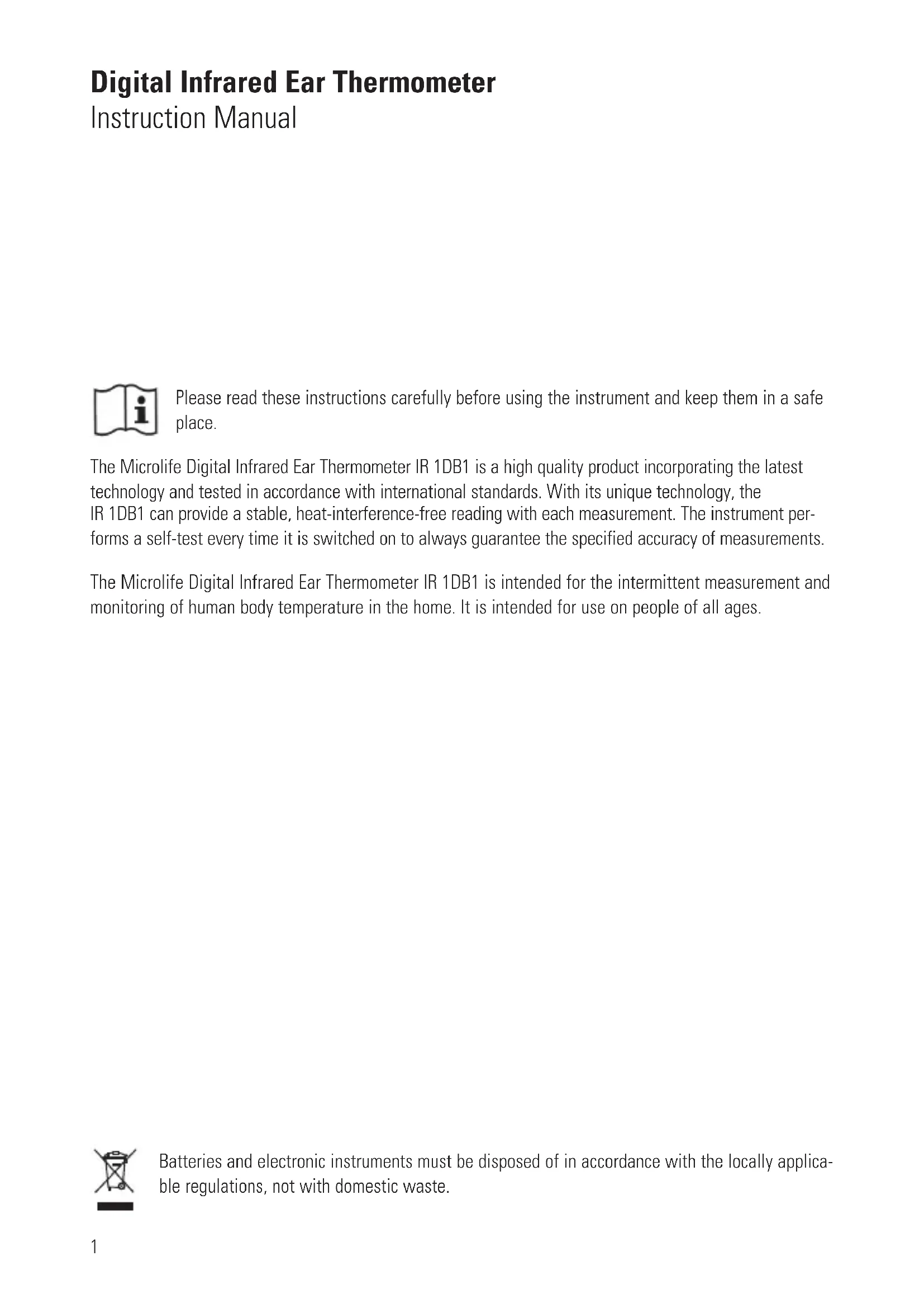 PT1 Digital Infrared Ear Thermometer Instruction Manual Please read these instructions carefully before using the instrument and keep them in a safe place. The Microlife Digital Infrared Ear Thermometer IR 1DB1 is a high quality product incorporating the latest technology and tested in accordance with international standards. With its unique technology, the IR 1DB1 can provide a stable, heat-interference-free reading with each measurement. The instrument per- forms a self-test every time it is switched on to always guarantee the specified accuracy of measurements. The Microlife Digital Infrared Ear Thermometer IR 1DB1 is intended for the intermittent measurement and monitoring of human body temperature in the home. It is intended for use on people of all ages. Batteries and electronic instruments must be disposed of in accordance with the locally applica- ble regulations, not with domestic waste.2 Table of Contents