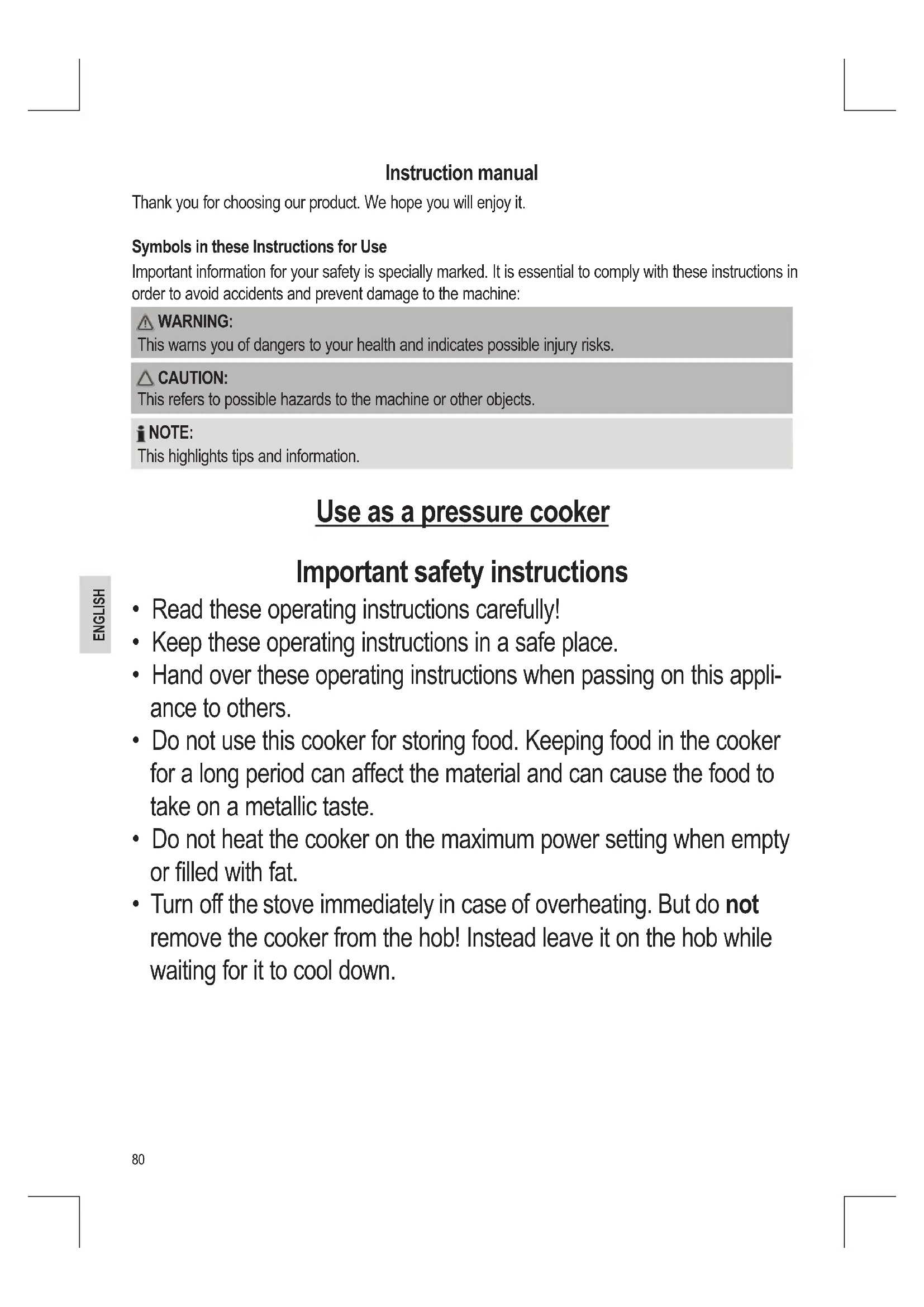 This warns you of dangers to your health and indicates possible injury risks. CAUTION: This refers to possible hazards to the machine or other objects. NOTE: This highlights tips and information. Use as a pressure cooker Important safety instructions