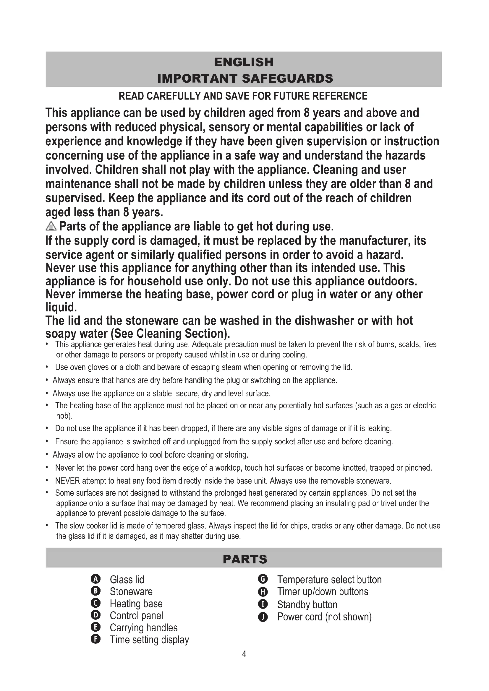 - The slow cooker lid is made of tempered glass. Always inspect the lid for chips, cracks or any other damage. Do not use the glass lid if it is damaged, as it may shatter during use. PARTS