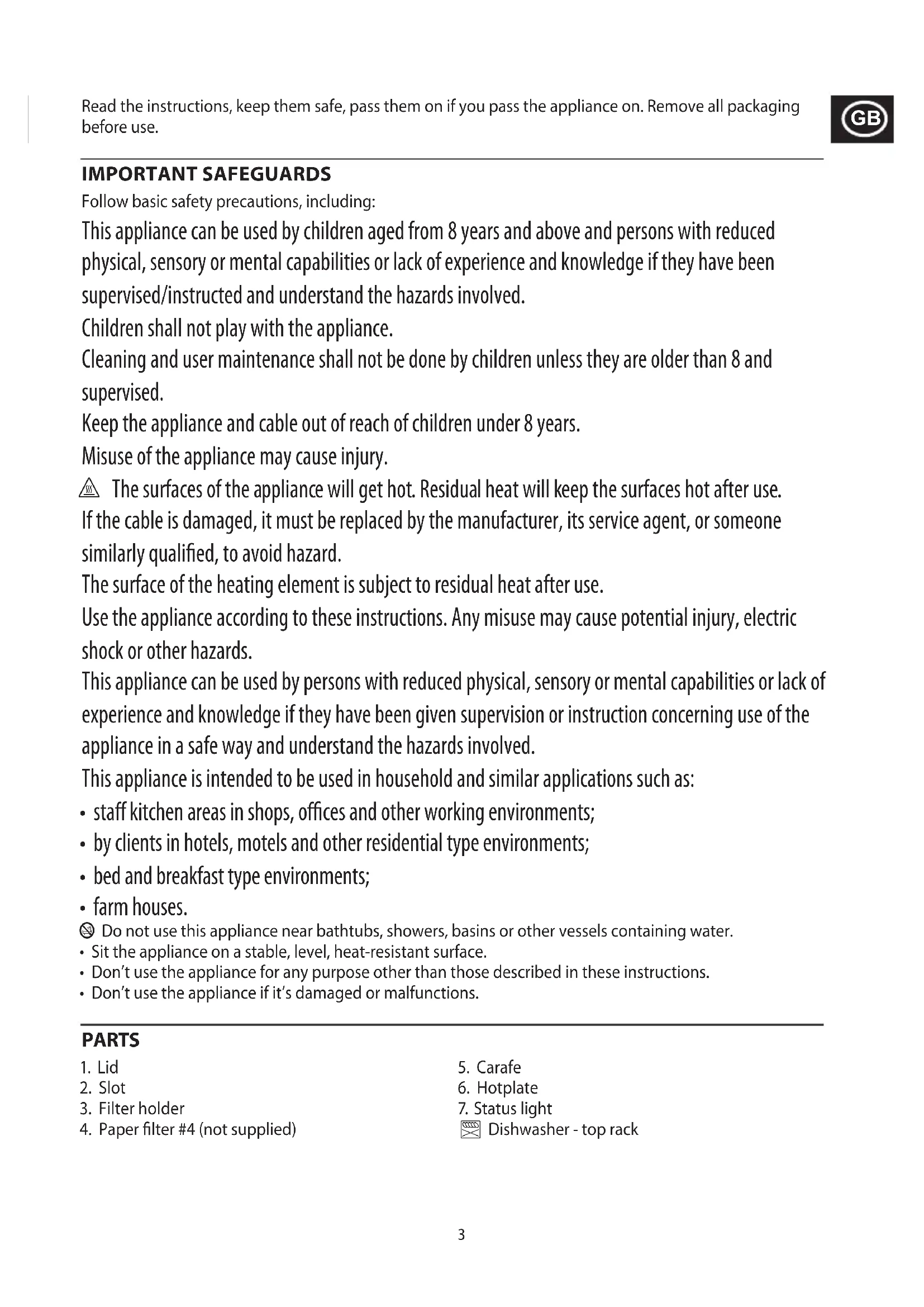 Read the instructions, keep them safe, pass them on if you pass the appliance on. Remove all packaging before use. IMPORTANT SAFEGUARDS Follow basic safety precautions, including: This appliance can be used by children aged from 8 years and above and persons with reduced physical, sensory or mental capabilities or lack of experience and knowledge if they have been supervised/instructed and understand the hazards involved. Children shall not play with the appliance. Cleaning and user maintenance shall not be done by children unless they are older than 8 and supervised. Keep the appliance and cable out of reach of children under 8 years. Misuse of the appliance may cause injury. h The surfaces of the appliance will get hot. Residual heat will keep the surfaces hot after use. If the cable is damaged, it must be replaced by the manufacturer, its service agent, or someone similarly qualied, to avoid hazard. The surface of the heating element is subject to residual heat after use. Use the appliance according to these instructions. Any misuse may cause potential injury, electric shock or other hazards. This appliance can be used by persons with reduced physical, sensory or mental capabilities or lack of experience and knowledge if they have been given supervision or instruction concerning use of the appliance in a safe way and understand the hazards involved. This appliance is intended to be used in household and similar applications such as: