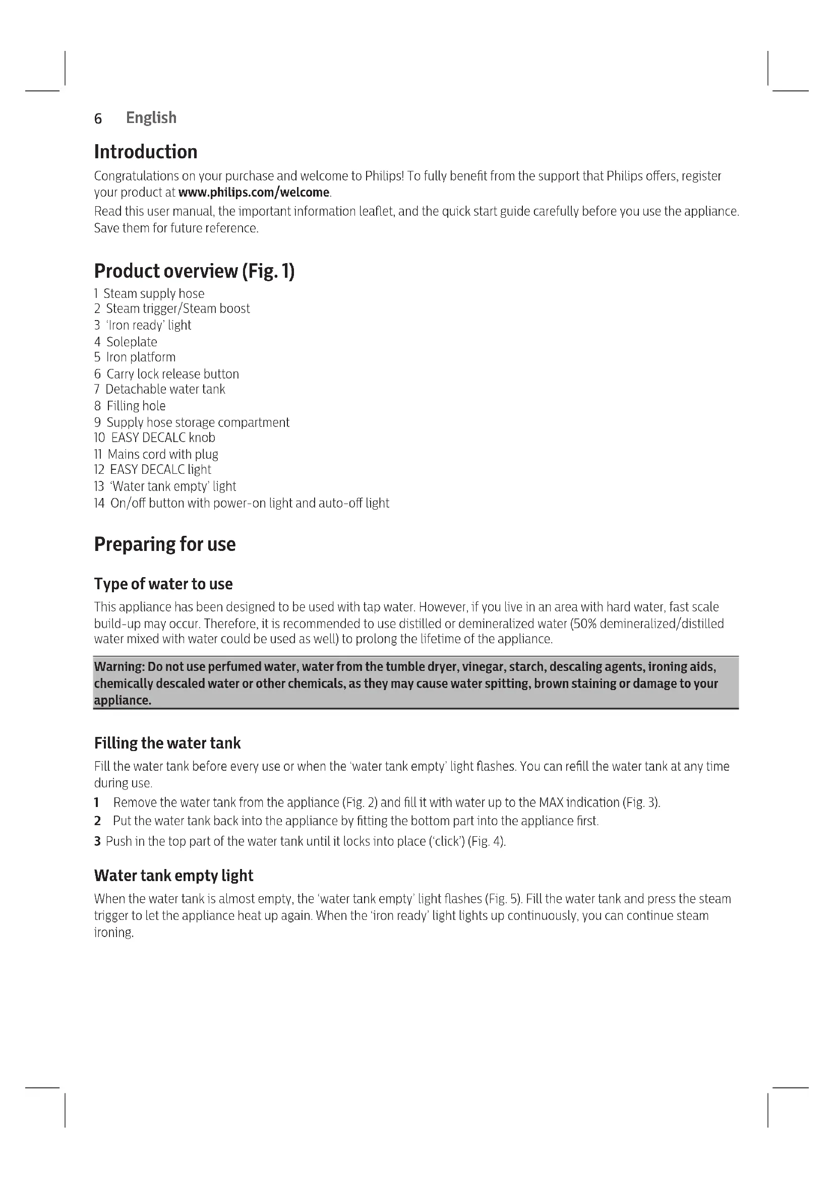 1English 6 Français 11 Português 16 24 286 Introduction Congratulations on your purchase and welcome to Philips! To fully benet from the support that Philips oers, register your product at www.philips.com/welcome. Read this user manual, the important information leaet, and the quick start guide carefully before you use the appliance. Save them for future reference. Product overview (Fig. 1) 1 Steam supply hose 2 Steam trigger/Steam boost 3 ‘Iron ready’ light 4 Soleplate 5 Iron platform 6 Carry lock release button 7 Detachable water tank 8 Filling hole 9 Supply hose storage compartment 10 EASY DECALC knob 11 Mains cord with plug 12 EASY DECALC light 13 ‘Water tank empty’ light 14 On/o button with power-on light and auto-o light Preparing for use Type of water to use This appliance has been designed to be used with tap water. However, if you live in an area with hard water, fast scale build-up may occur. Therefore, it is recommended to use distilled or demineralized water (50% demineralized/distilled water mixed with water could be used as well) to prolong the lifetime of the appliance.