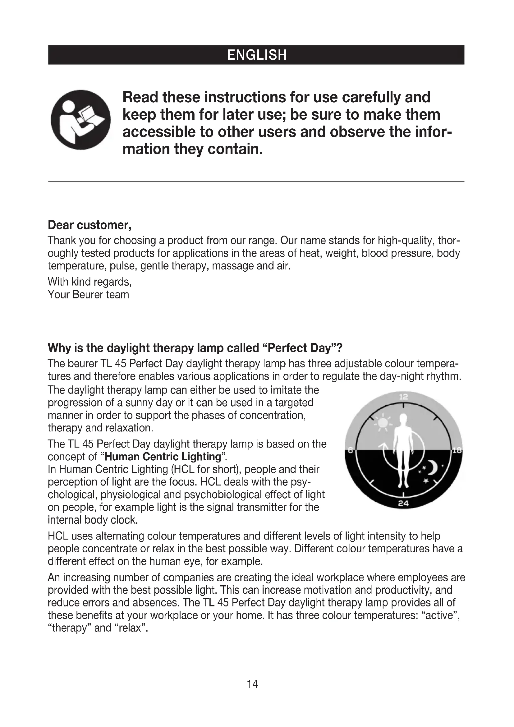 mation they contain. Dear customer, Thank you for choosing a product from our range. Our name stands for high-quality, thor- oughly tested products for applications in the areas of heat, weight, blood pressure, body temperature, pulse, gentle therapy, massage and air. With kind regards, Your Beurer team Why is the daylight therapy lamp called “Perfect Day”? The beurer TL 45 Perfect Day daylight therapy lamp has three adjustable colour tempera- tures and therefore enables various applications in order to regulate the day-night rhythm. The daylight therapy lamp can either be used to imitate the progression of a sunny day or it can be used in a targeted manner in order to support the phases of concentration, therapy and relaxation. The TL 45 Perfect Day daylight therapy lamp is based on the concept of “Human Centric Lighting”. In Human Centric Lighting (HCL for short), people and their perception of light are the focus. HCL deals with the psy- chological, physiological and psychobiological effect of light on people, for example light is the signal transmitter for the internal body clock. HCL uses alternating colour temperatures and different levels of light intensity to help people concentrate or relax in the best possible way. Different colour temperatures have a different effect on the human eye, for example. An increasing number of companies are creating the ideal workplace where employees are provided with the best possible light. This can increase motivation and productivity, and reduce errors and absences. The TL 45 Perfect Day daylight therapy lamp provides all of these benefits at your workplace or your home. It has three colour temperatures: “active”, “therapy” and “relax”.15 active therapy relax Simulated time of day Morning Afternoon Evening Activity Concentrated work Therapy at 10,000 lux Relaxation Kelvin 5,000 kelvins 6,500 kelvins 3,000 kelvins Lux 7,000 lux at a distance of approx. 20cm 10,000 lux at a distance of approx. 20cm 3,000 lux at a distance of approx. 20cm Why use a daylight therapy lamp? When the hours of daylight are noticeably shorter in autumn and people increasingly stay inside in winter, the effects of a lack of light may become apparent. This is often described as “winter depression”. The symptoms can present themselves in a number of ways: