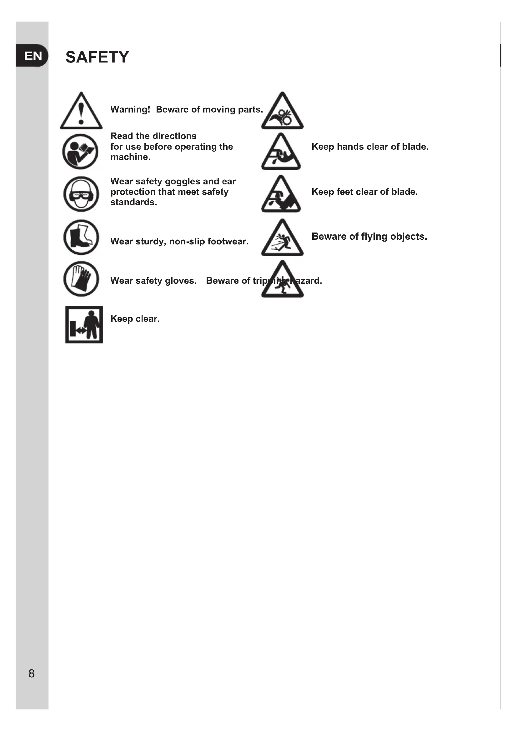 ENSAFETY Warning! Bewareofmovingparts. Read the directions forusebeforeoperatingthe machine. Keephandsclearofblade. Wearsafetygogglesandear protectionthatmeetsafety standards. Keepfeetclearofblade. Wearsturdy,non-slipfootwear. Bewareofflyingobjects. Wearsafetygloves. Bewareoftrippinghazard. Keepclear.