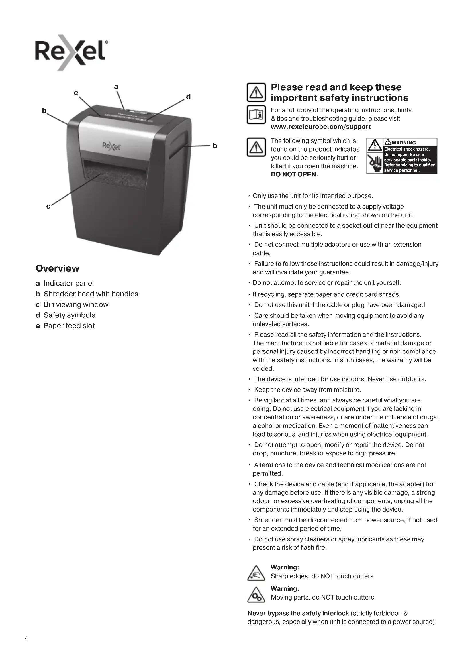 Please read and keep these important safety instructions For a full copy of the operating instructions, hints & tips and troubleshooting guide, please visit www.rexeleurope.com/support Overview a Indicator panel b Shredder head with handles c Bin viewing window d Safety symbols e Paper feed slot