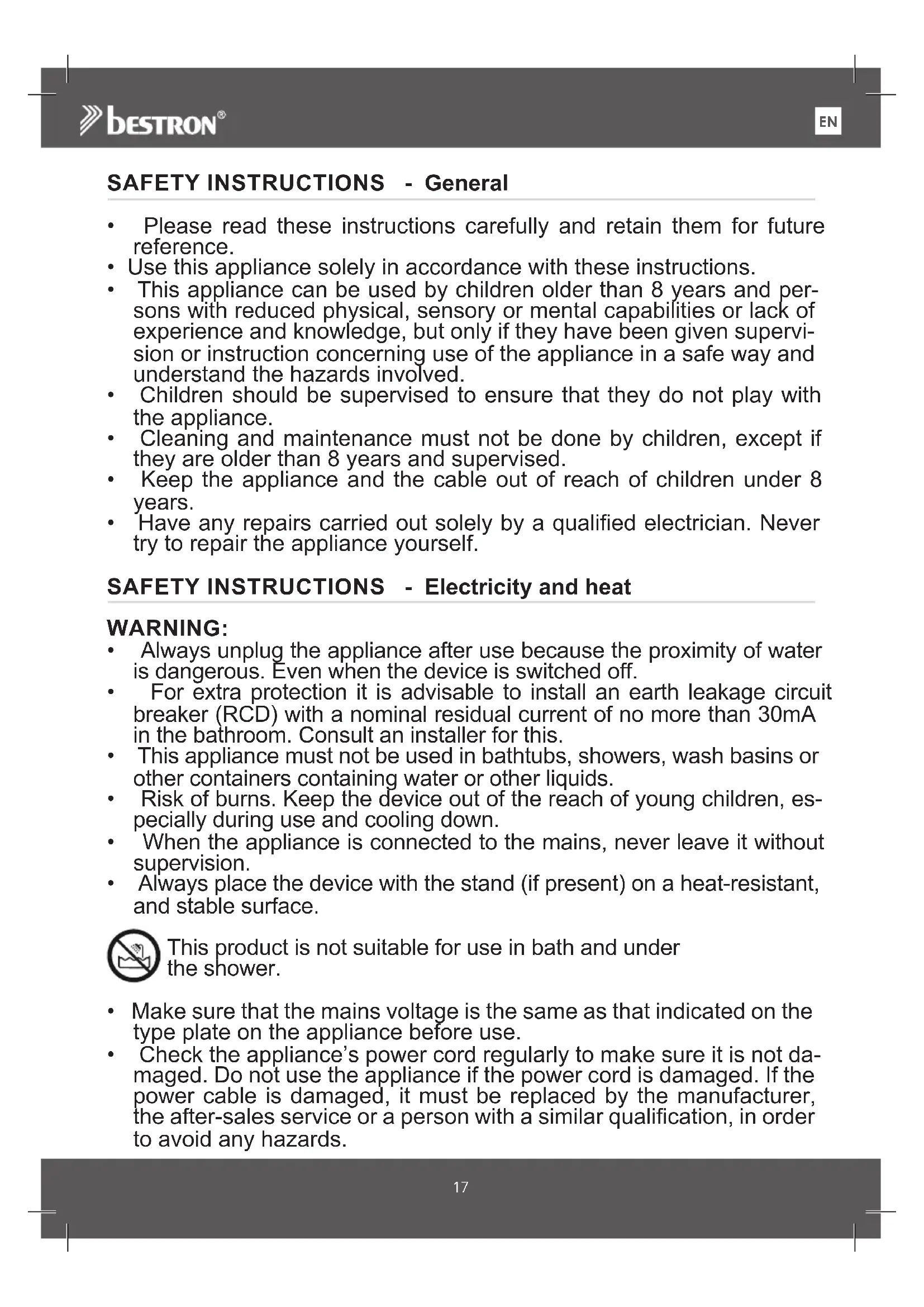 SERVICE If a fault should occur please contact the BESTRON service department: www.bestron.com/service