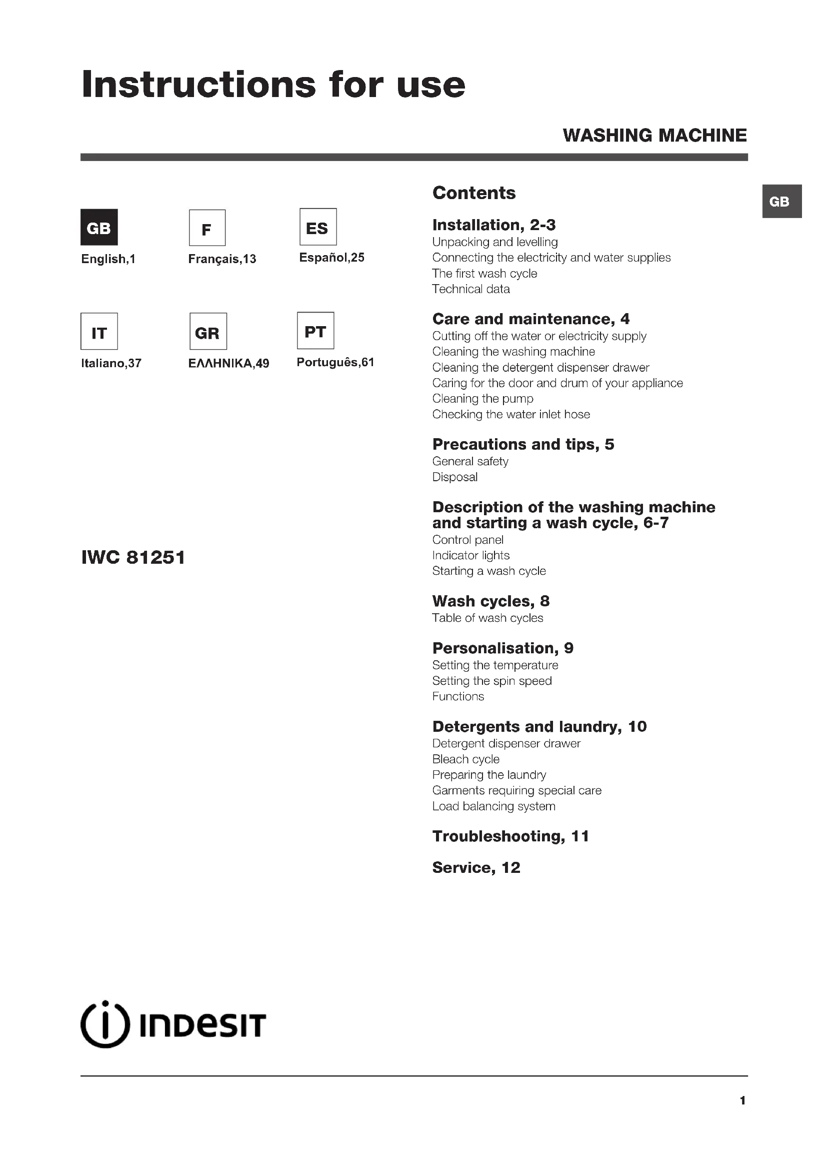 Contents Installation, 2-3 Unpacking and levelling Connecting the electricity and water supplies The first wash cycle Technical data Care and maintenance, 4 Cutting off the water or electricity supply Cleaning the washing machine Cleaning the detergent dispenser drawer Caring for the door and drum of your appliance Cleaning the pump Checking the water inlet hose Precautions and tips, 5 General safety Disposal Description of the washing machine and starting a wash cycle, 6-7 Control panel Indicator lights Starting a wash cycle Wash cycles, 8 Table of wash cycles Personalisation, 9 Setting the temperature Setting the spin speed Functions Detergents and laundry, 10 Detergent dispenser drawer Bleach cycle Preparing the laundry Garments requiring special care Load balancing system Troubleshooting, 11 Service, 12 IWC 81251 Instructions for use WASHING MACHINE English,1