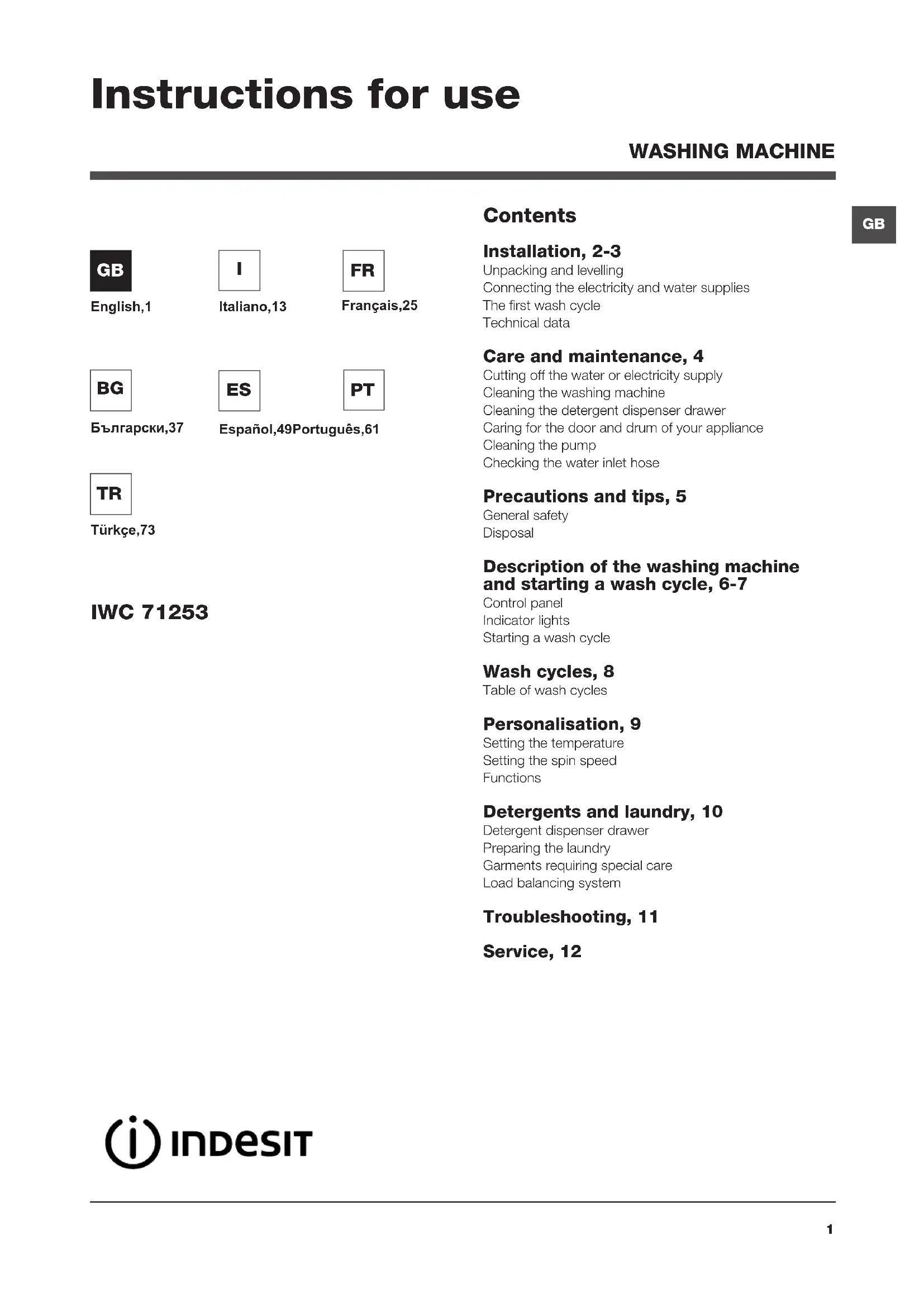 Contents Installation, 2-3 Unpacking and levelling Connecting the electricity and water supplies The first wash cycle Technical data Care and maintenance, 4 Cutting off the water or electricity supply Cleaning the washing machine Cleaning the detergent dispenser drawer Caring for the door and drum of your appliance Cleaning the pump Checking the water inlet hose Precautions and tips, 5 General safety Disposal Description of the washing machine and starting a wash cycle, 6-7 Control panel Indicator lights Starting a wash cycle Wash cycles, 8 Table of wash cycles Personalisation, 9 Setting the temperature Setting the spin speed Functions Detergents and laundry, 10 Detergent dispenser drawer Preparing the laundry Garments requiring special care Load balancing system Troubleshooting, 11 Service, 12 IWC 71253 Instructions for use WASHING MACHINE English,1
