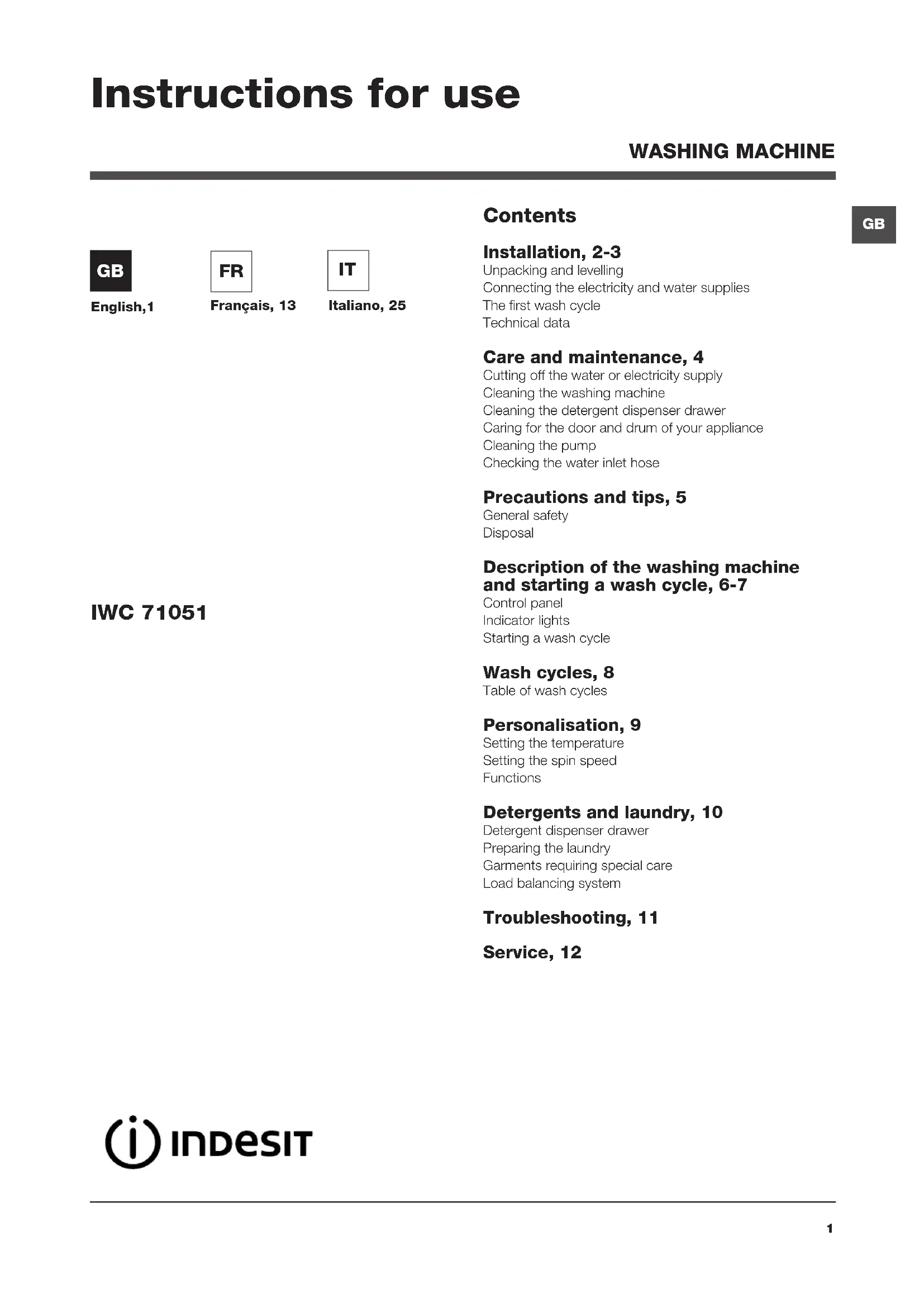 Contents Installation, 2-3 Unpacking and levelling Connecting the electricity and water supplies The first wash cycle Technical data Care and maintenance, 4 Cutting off the water or electricity supply Cleaning the washing machine Cleaning the detergent dispenser drawer Caring for the door and drum of your appliance Cleaning the pump Checking the water inlet hose Precautions and tips, 5 General safety Disposal Description of the washing machine and starting a wash cycle, 6-7 Control panel Indicator lights Starting a wash cycle Wash cycles, 8 Table of wash cycles Personalisation, 9 Setting the temperature Setting the spin speed Functions Detergents and laundry, 10 Detergent dispenser drawer Preparing the laundry Garments requiring special care Load balancing system Troubleshooting, 11 Service, 12 IWC 71051 Instructions for use WASHING MACHINE English,1