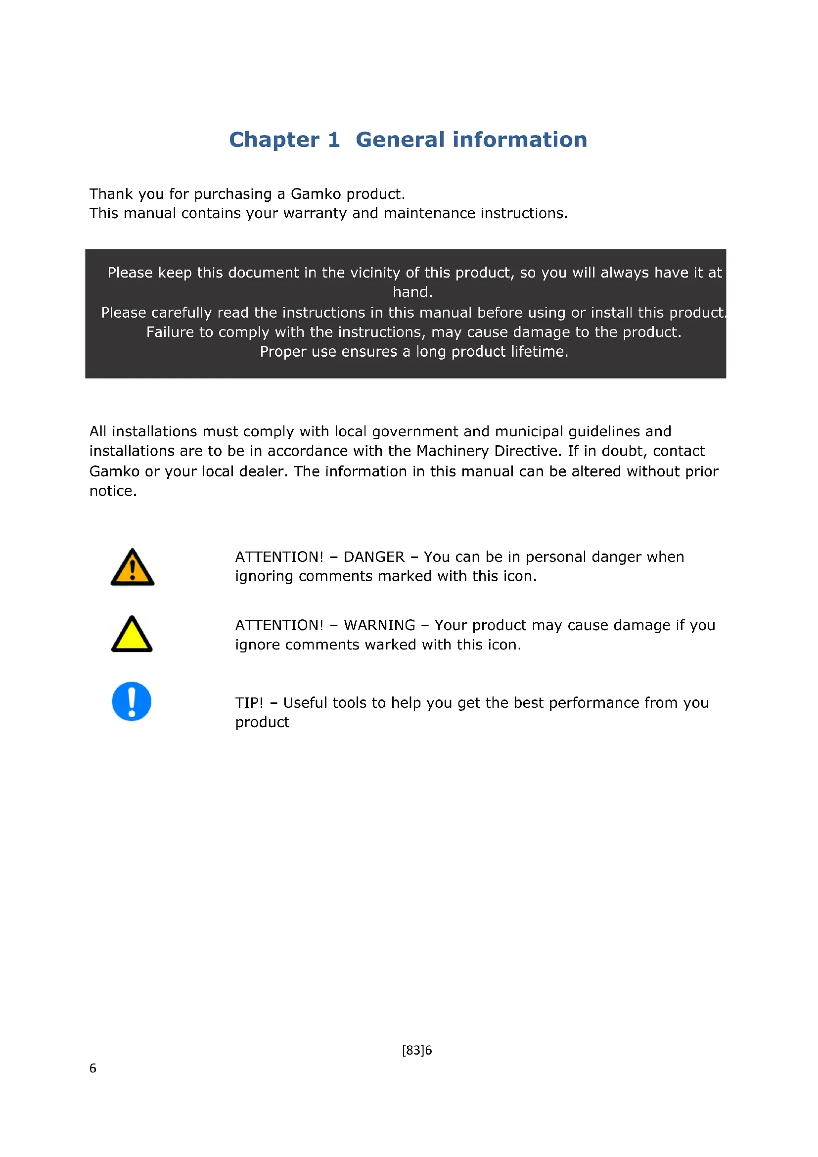 All installations must comply with local government and municipal guidelines and installations are to be in accordance with the Machinery Directive. If in doubt, contact Gamko or your local dealer. The information in this manual can be altered without prior notice.