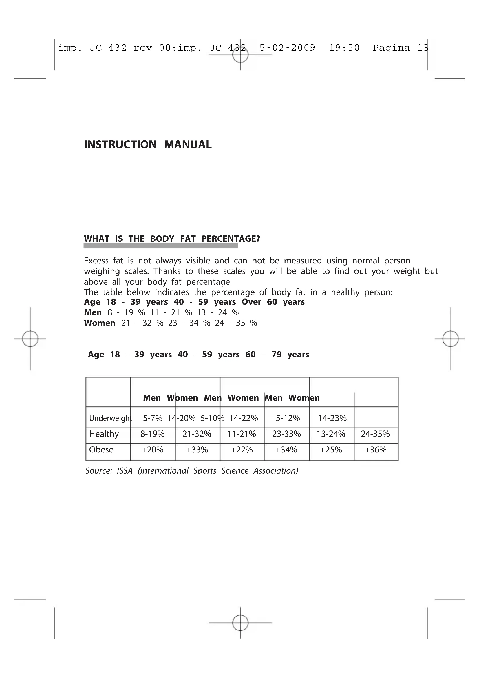 Open the battery compartment lid, underneath the scales. Remove the battery isolating sticker,select the unit of measurement (st/kg/lb) with the appropriate button inside the battery compartment and close the lid. Position the scales on a flat and stable surface (it is not recommended to use rugs). Weight-only function Press the surface of the scales with your foot or press : the display will switch on, and then wait until it displays “0.0”. Step on to the scales and proceed to weight detection. Once the weight has been detected the display will start to flash. Step off the scales: successively, the display will indicate “err2” (that means it is not possible to proceed to calculate the percentage of fat, water, muscle and bone mass)JC 434 PERSONAL SCALE Body fat / body water/body muscle To calculate the percentage of fat and water it is necessary to insert some personal data Press the surface of the scales with your foot: the display will switch on, and then wait until it displays “0.0”. Press SET Press“ ” and“” to select one of the 4 users. Press SET to confirm. Press“ ” and“”to select the man or woman parameter. Press SET to confirm. Press“ ” and“” to insert your age (10 - 80 years). Press SET to confirm. Press“ ” and“” to insert your height. Press SET to confirm. The inserted values will flash and be memorised in the scales. Once the scales display “0.0” it is possible to proceed with measurement. Step on to the scales in your bare feet, keep an upright position, distribute your weight as evenly as possible and keep your feet parallel on top of the sensors making sure they do not touch. First of all the scales will detect your weight, then “OOOO” is displayed (that decreases from left to right), which indicates that the scales are performing the impedance analysis used to calculate the percentage of fat, water, muscle, bone mass and Kcal. For this reason it is necessary to remain still on the platform and to keep an upright position.Once the scales have finished the analysis the display will show the following in an alternating manner: fat mass (FAT), percentage of water (BW) , weight, percentage of muscle mass (MUS) The tables below supply information about the physical state in relation to the percentage of body fat and the percentage of water. IMPORTANT: the data in the table below is for reference only. imp. JC 432 rev 00:imp. JC 432 5-02-2009 19:50 Pagina 19JC 434 PERSONAL SCALE Age Female Male Indicators Fat % Fat % <=30 4.0-28.0 4.0-22.0 Green 28.1-33.0 22.1-27.0 Yellow 33.1-80.0 27.1-80.0 Red >30 4.0-30.0 4.0-24.0 Green 30.1-35.0 24.1-29.0 Yellow 35.1-80.0 29.1-80.0 Red imp. JC 432 rev 00:imp. JC 432 5-02-2009 19:50 Pagina 20