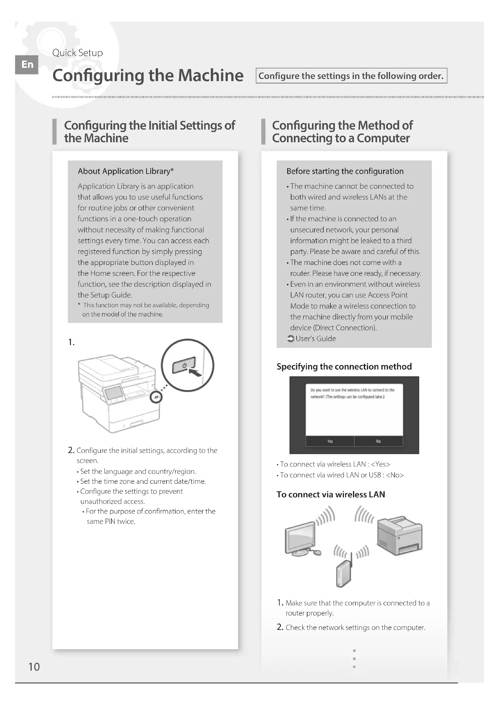 Configure the initial settings, according to the screen.• Set the language and country/region.• Set the time zone and current date/time.• Configure the settings to prevent unauthorized access.• For the purpose of confirmation, enter the same PIN twice.Before starting the configuration• The machine cannot be connected to both wired and wireless LANs at the same time.• If the machine is connected to an unsecured network, your personal information might be leaked to a third party. Please be aware and careful of this.• The machine does not come with a router. Please have one ready, if necessary.• Even in an environment without wireless LAN router, you can use Access Point Mode to make a wireless connection to the machine directly from your mobile device (Direct Connection). User's GuideSpecifying the connection method• To connect via wireless LAN : <Yes>• To connect via wired LAN or USB : <No>To connect via wireless LAN Make sure that the computer is connected to a router properly. Check the network settings on the computer.
