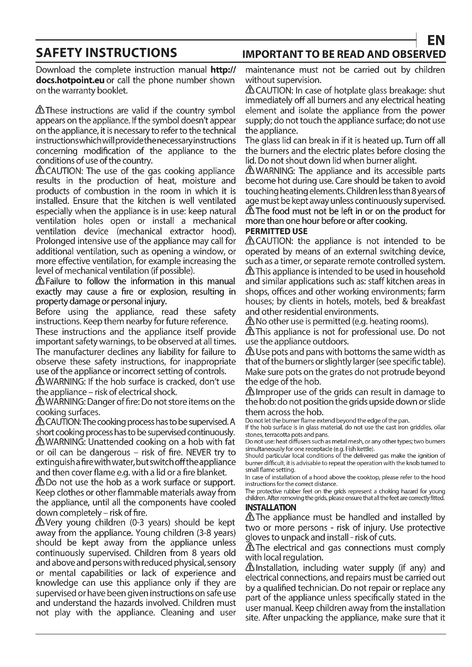 Download the complete instruction manual http:// docs.hotpoint.eu or call the phone number shown on the warranty booklet. These instructions are valid if the country symbol appears on the appliance. If the symbol doesn’t appear on the appliance, it is necessary to refer to the technical instructions which will provide the necessary instructions concerning modication of the appliance to the conditions of use of the country. CAUTION: The use of the gas cooking appliance results in the production of heat, moisture and products of combustion in the room in which it is installed. Ensure that the kitchen is well ventilated especially when the appliance is in use: keep natural ventilation holes open or install a mechanical ventilation device (mechanical extractor hood). Prolonged intensive use of the appliance may call for additional ventilation, such as opening a window, or more eective ventilation, for example increasing the level of mechanical ventilation (if possible). Failure to follow the information in this manual exactly may cause a re or explosion, resulting in property damage or personal injury. Before using the appliance, read these safety instructions. Keep them nearby for future reference. These instructions and the appliance itself provide important safety warnings, to be observed at all times. The manufacturer declines any liability for failure to observe these safety instructions, for inappropriate use of the appliance or incorrect setting of controls.