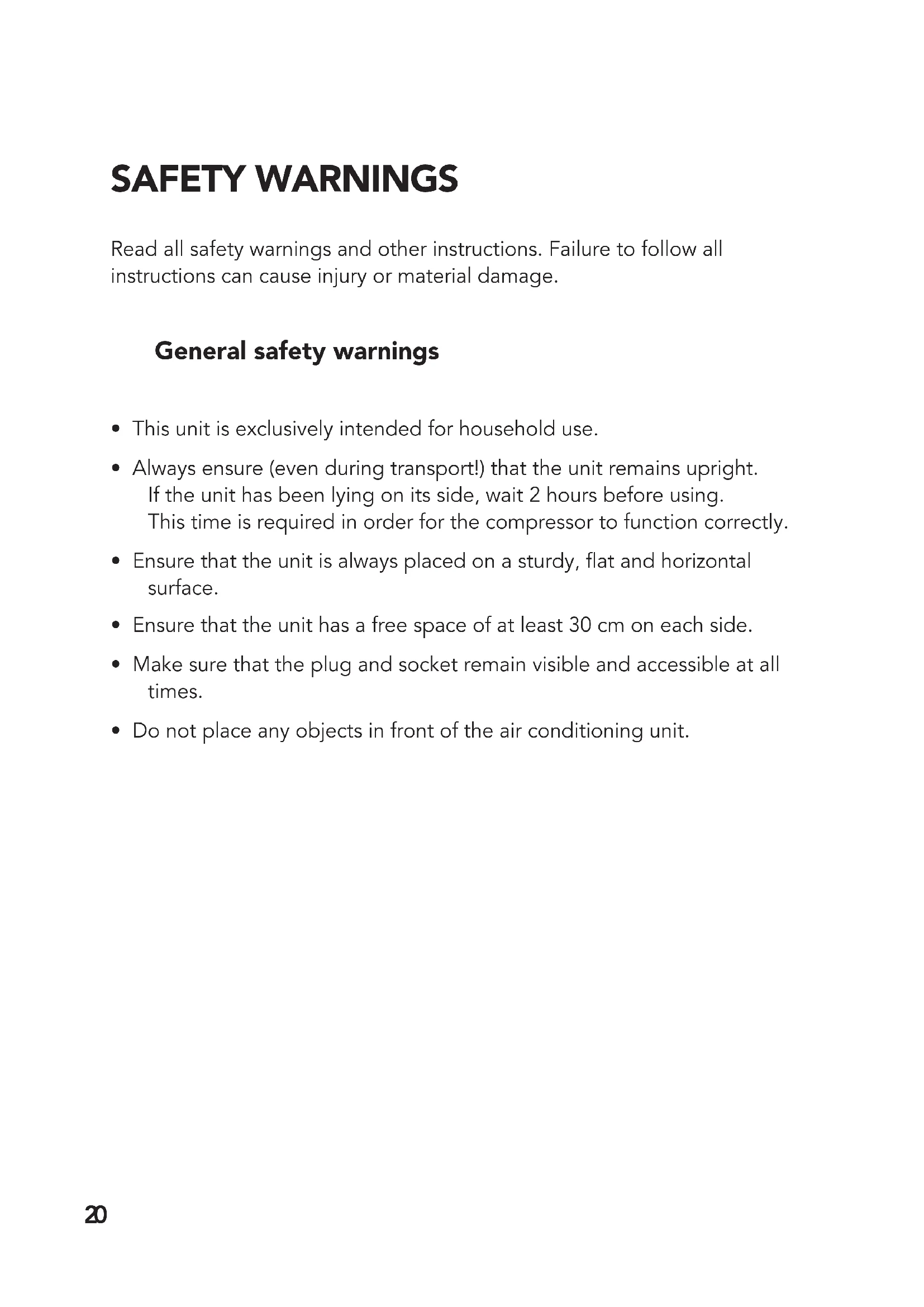 - This unit is exclusively intended for household use.• Always ensure (even during transport!) that the unit remains upright. If the unit has been lying on its side, wait 2 hours before using. This time is required in order for the compressor to function correctly.• Ensure that the unit is always placed on a sturdy, at and horizontal surface.• Ensure that the unit has a free space of at least 30 cm on each side.• Make sure that the plug and socket remain visible and accessible at all times.• Do not place any objects in front of the air conditioning unit.21