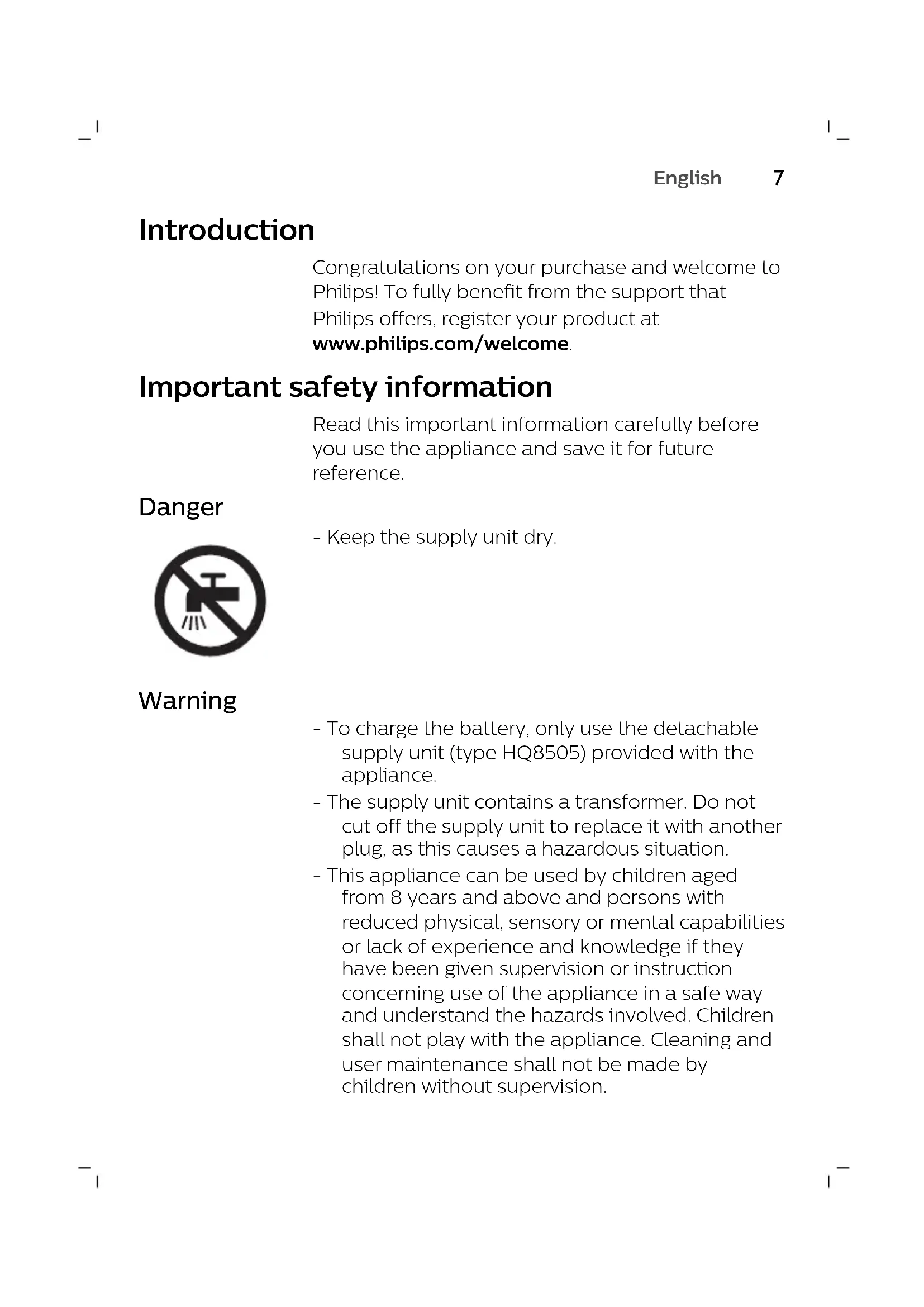 EnglishIntroduction Congratulations on your purchase and welcome to Philips! To fully benefit from the support that Philips offers, register your product at www.philips.com/welcome. Important safety information Read this important information carefully before you use the appliance and save it for future reference. Danger - Keep the supply unit dry. Warning - To charge the battery, only use the detachable supply unit (type HQ8505) provided with the appliance. - The supply unit contains a transformer. Do not cut off the supply unit to replace it with another plug, as this causes a hazardous situation. - This appliance can be used by children aged from 8 years and above and persons with reduced physical, sensory or mental capabilities or lack of experience and knowledge if they have been given supervision or instruction concerning use of the appliance in a safe way and understand the hazards involved. Children shall not play with the appliance. Cleaning and user maintenance shall not be made by children without supervision.