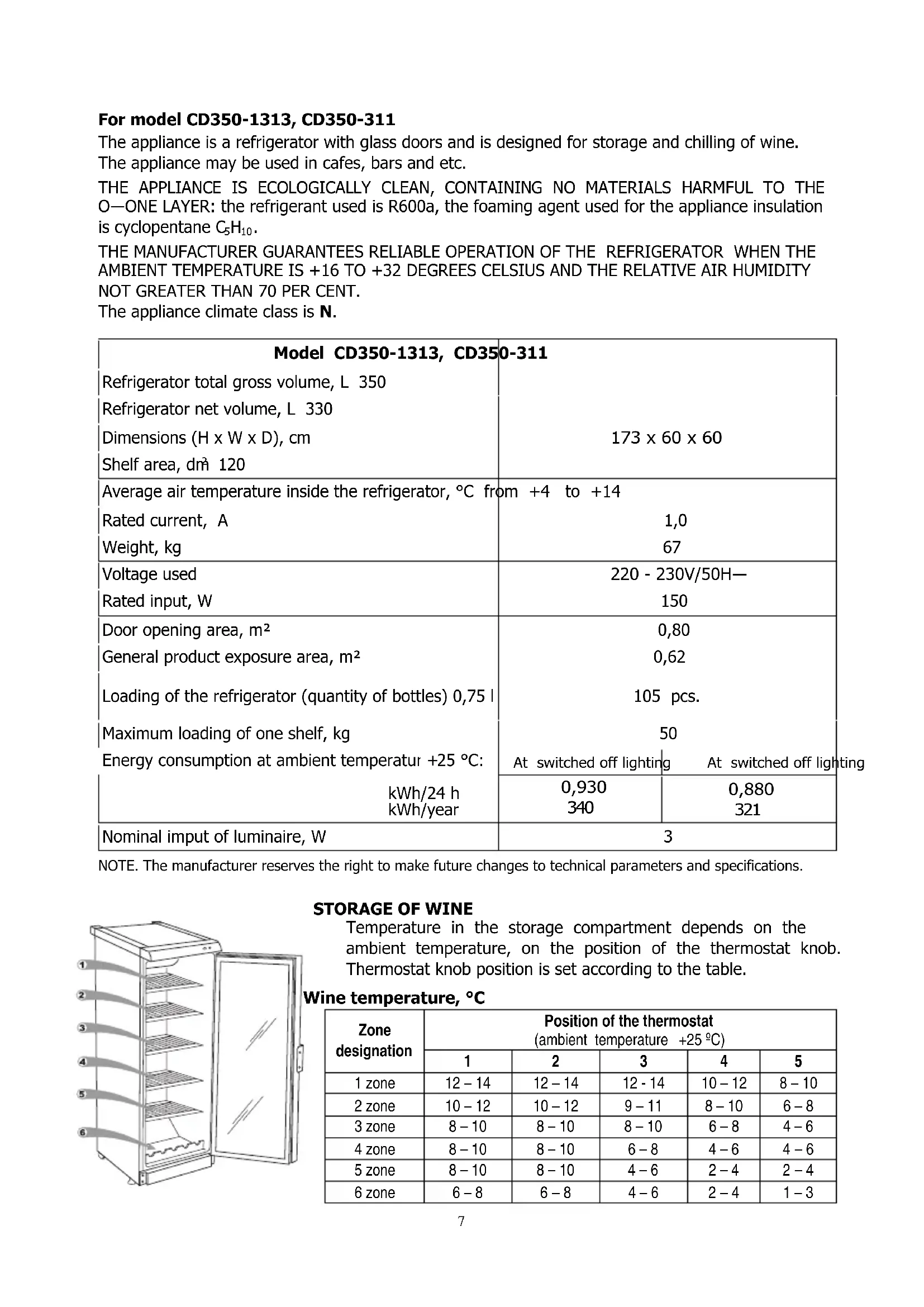 For model CD350-1313, CD350-311 The appliance is a refrigerator with glass doors and is designed for storage and chilling of wine. The appliance may be used in cafes, bars and etc. THE APPLIANCE IS ECOLOGICALLY CLEAN, CONTAINING NO MATERIALS HARMFUL TO THE OZONE LAYER: the refrigerant used is R600a, the foaming agent used for the appliance insulation is cyclopentane C