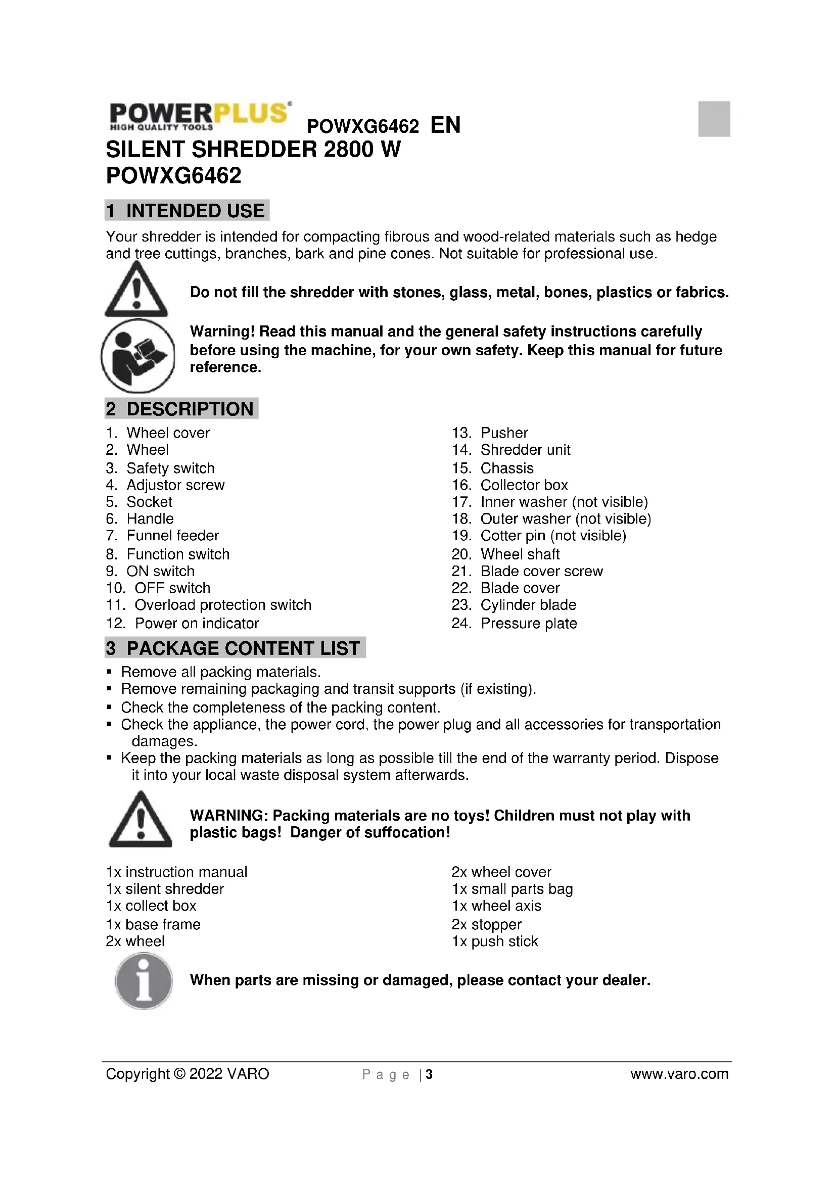 plastic bags! Danger of suffocation! 1x instruction manual 1x silent shredder 1x collect box 1x base frame 2x wheel 2x wheel cover 1x small parts bag 1x wheel axis 2x stopper 1x push stick When parts are missing or damaged, please contact your dealer.POWXG6462 EN Copyright © 2022 VARO P a g e | 4 www.varo.com 4 SYMBOLS In this manual and/or on the machine the following symbols are used: